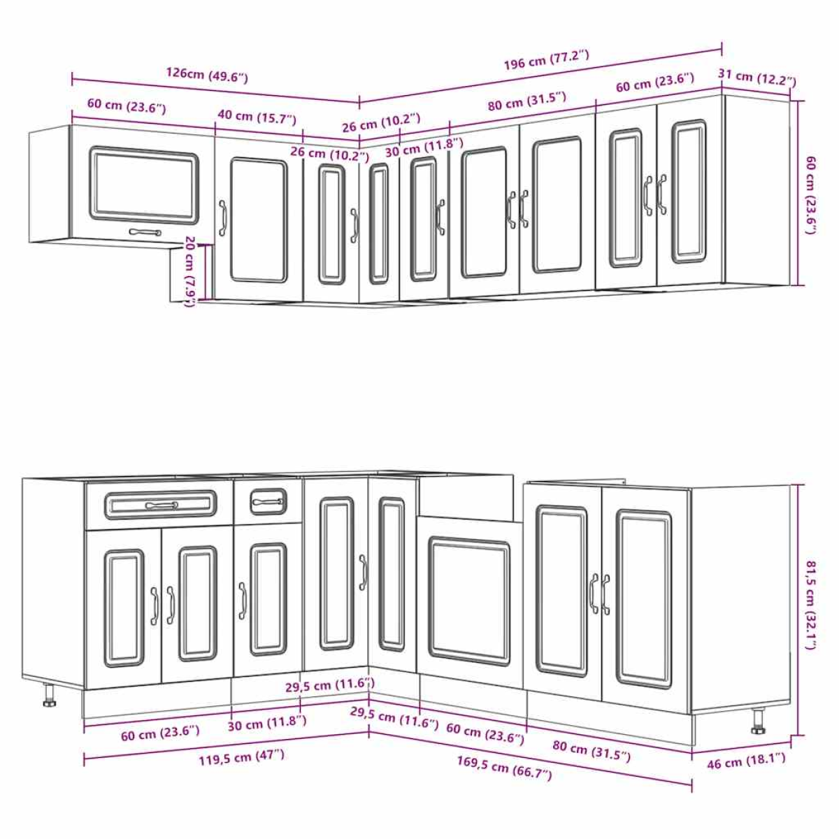- 1 x kitchen corner base cabinet: 75.5 x 75.5 x 81.5 cm (W x D x H)