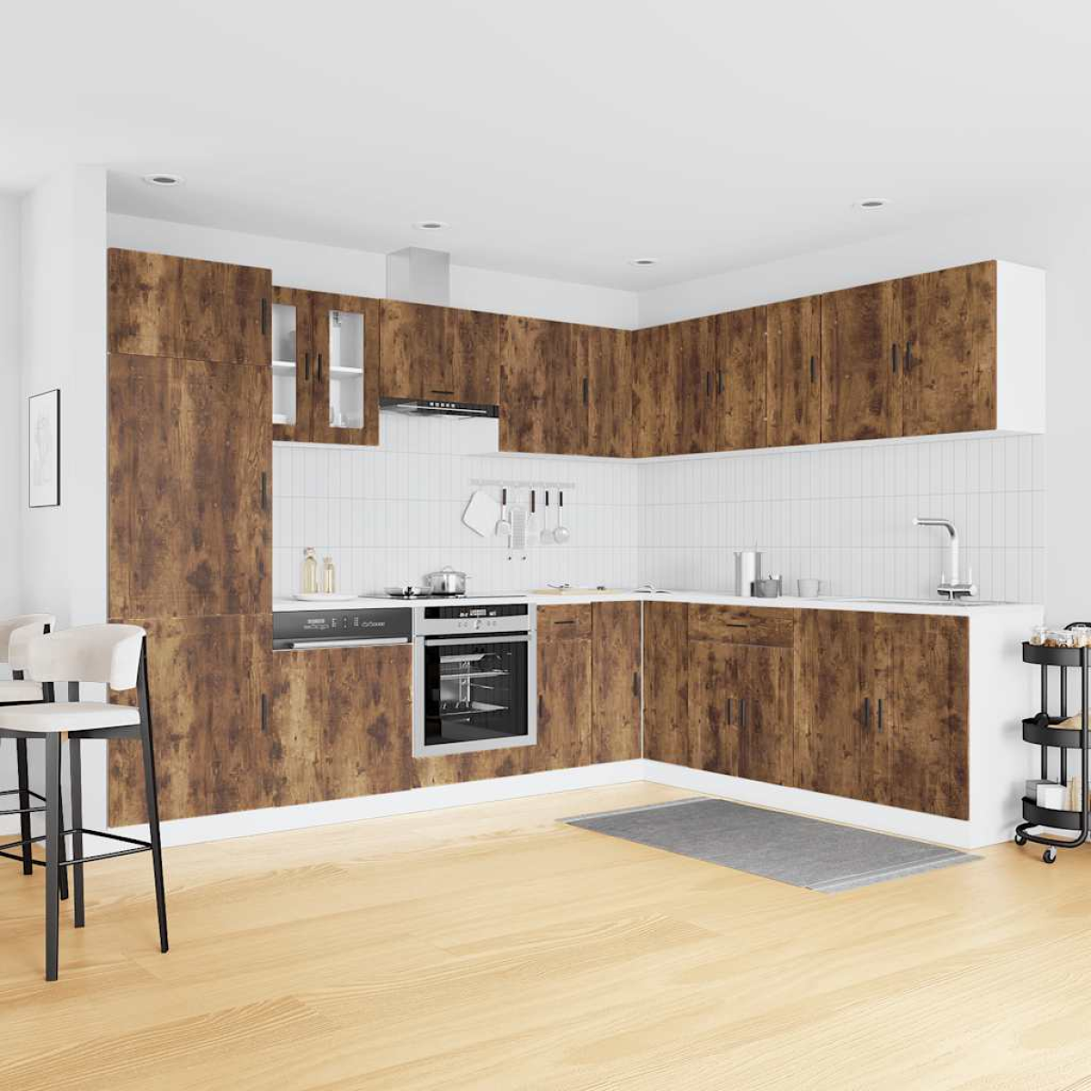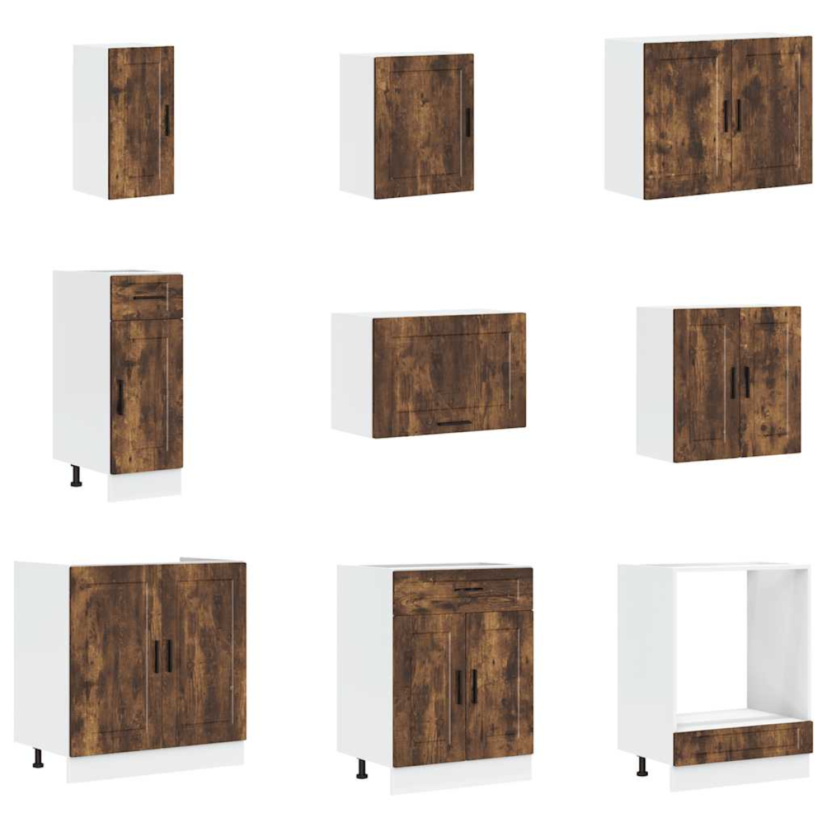 This 14-piece kitchen cabinet set, with its elegant design, optimises your kitchen space and provides ample storage space for your personal belongings! Stable and durable material: Engineered wood is a durable and stable material with a smooth surface that is resistant to moisture, warping, and splitting, making it a reliable choice for a variety of projects.Ample storage space: The kitchen cabinet set has many compartments, and offers sufficient space to store bowls, plates, pots, and other kitchen appliances.Adjustable feet: The bottom cabinets feature adjustable feet that can be adjusted in height to suit your kitchen layout.Easy to maintain: Thanks to its smooth surface, these kitchen cabinets are easy to clean with a damp cloth and require less maintenance. Warning:This product must be secured by installing a worktop. Good to know:Screw(s) and plug(s) for inside the wall are not included. Seek and use screw(s) and plug(s) suitable for your walls. If you are uncertain, seek professional advice. Read and follow each step of the instruction carefully.The worktop, sink and faucet are not included in the delivery.