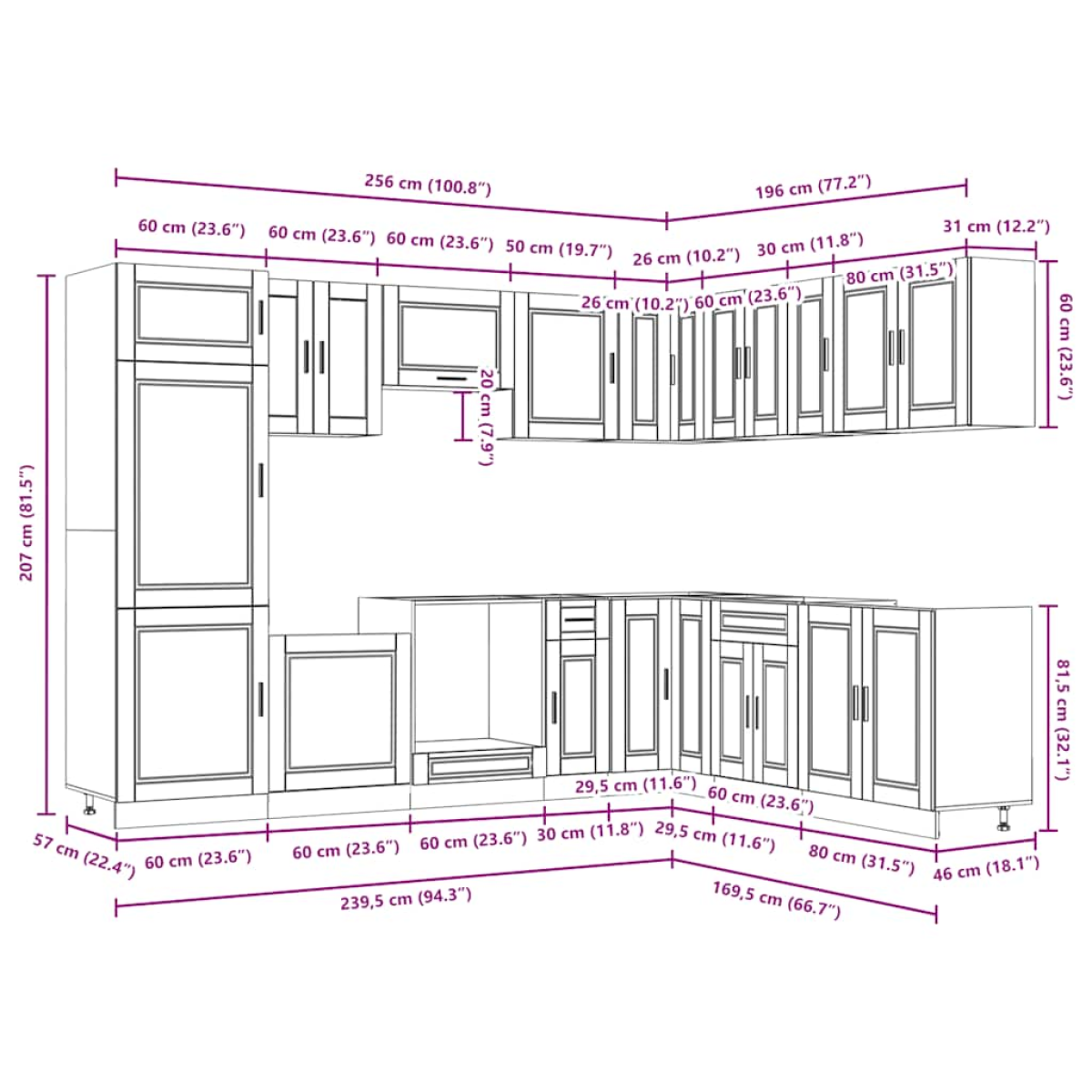 - 1 x Kitchen cupboard: 60 x 57 x 207 cm (W x D x H)
