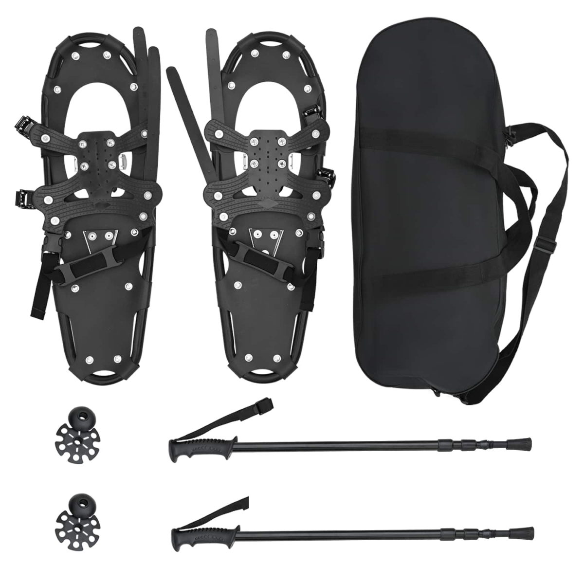 This 3 IN 1 Modern Snowshoe set with Hiking Poles is tailored for winter enthusiasts who crave adventure amidst snow. Emphasizing simplicity and functionality, it promises an effortless glide over snow-blanketed landscapes, making it perfect for outdoor aficionados. With its modern style, it attracts both beginner and expert snowshoe hikers looking for ease, agility, and thrilling winter expeditions. Aluminum Frame &Polyethylene Deck: Engineered for durability, the aluminum frame and polyethylene deck withstand the harsh outdoors, providing steadfast performance during snow hikes. Their resistance to cold ensures stability and strength, allowing enthusiasts to navigate through snow effortlessly. Complete Set: The package comes with a pair of snowshoes, two adjustable hiking poles, and a carrying bag, making it ideal for those seeking a full snow trekking kit in one purchase. Each component is designed for ease of transport and storage, ensuring you are adventure-ready at all times. Cold-resistant Features: The HDPE deck is crafted for cold settings, while the adjustable heel strap offers perfect foot alignment. This ensures your feet remain in place at all times for uninterrupted trekking, thus promoting safety and control on all terrains. Versatile Uses: Whether scaling mountaintops or trailing through secluded woods, it's built to accommodate shoe sizes 38 to 48 with a ratchet system for readjustment, lending flexibility to multiple users. Easy Maintenance: Store the gear in cool, dry places and wipe it with a dry cloth to maintain its pristine condition. Avoid pavement walks to preserve deck integrity and inspect before each seasonal use for sustained functionality.