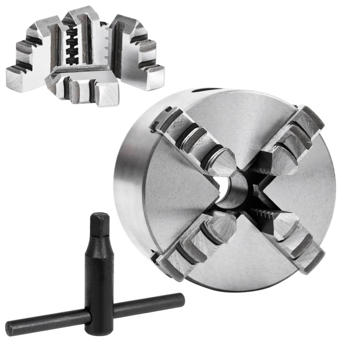 This self-centring 4 jaw lathe chuck can perform a wide range of tasks, expanding the possibilities of making your original designs. It also proves high clamping accuracy on a wide range of surfaces, such as a fixed solid or hollow circle material, a triangular material or a hexagonal material. It is made of high-quality steel with high hardness and wear-resistance, making it strong and durable. This chuck is with 4 jaw design, self-centring, compact size and easy to use.
