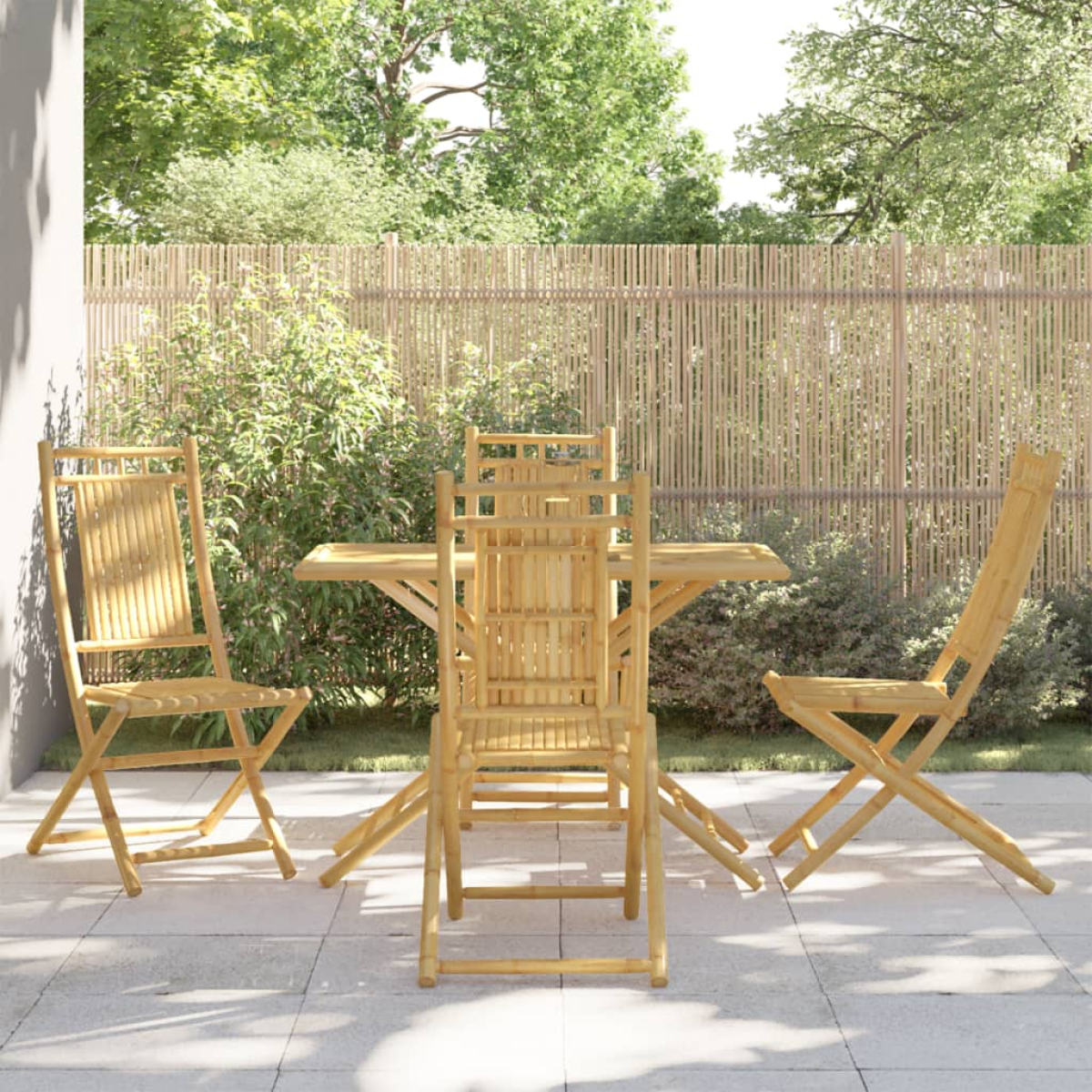This garden dining set, with an elegant and contemporary design, will be a great choice for dining or relaxing in the garden. Durable and long-lasting: As a natural material, bamboo boasts good breathability and a low odour. These qualities make the garden dining set durable, water-resistant, and long-lasting.Foldable design: The outdoor dining table and chairs can be easily folded away when not in use, for easy storage and transportation.Stable top: The stable top of the garden table is ideal for placing your drink or any other necessity you need close at hand.Comfortable seating experience: Featuring a backrest, the outdoor chair gives you the utmost comfort. Good to know:To make sure your outdoor furniture stays beautiful, we recommend protecting it with a waterproof cover.
