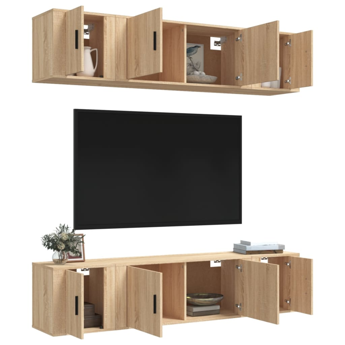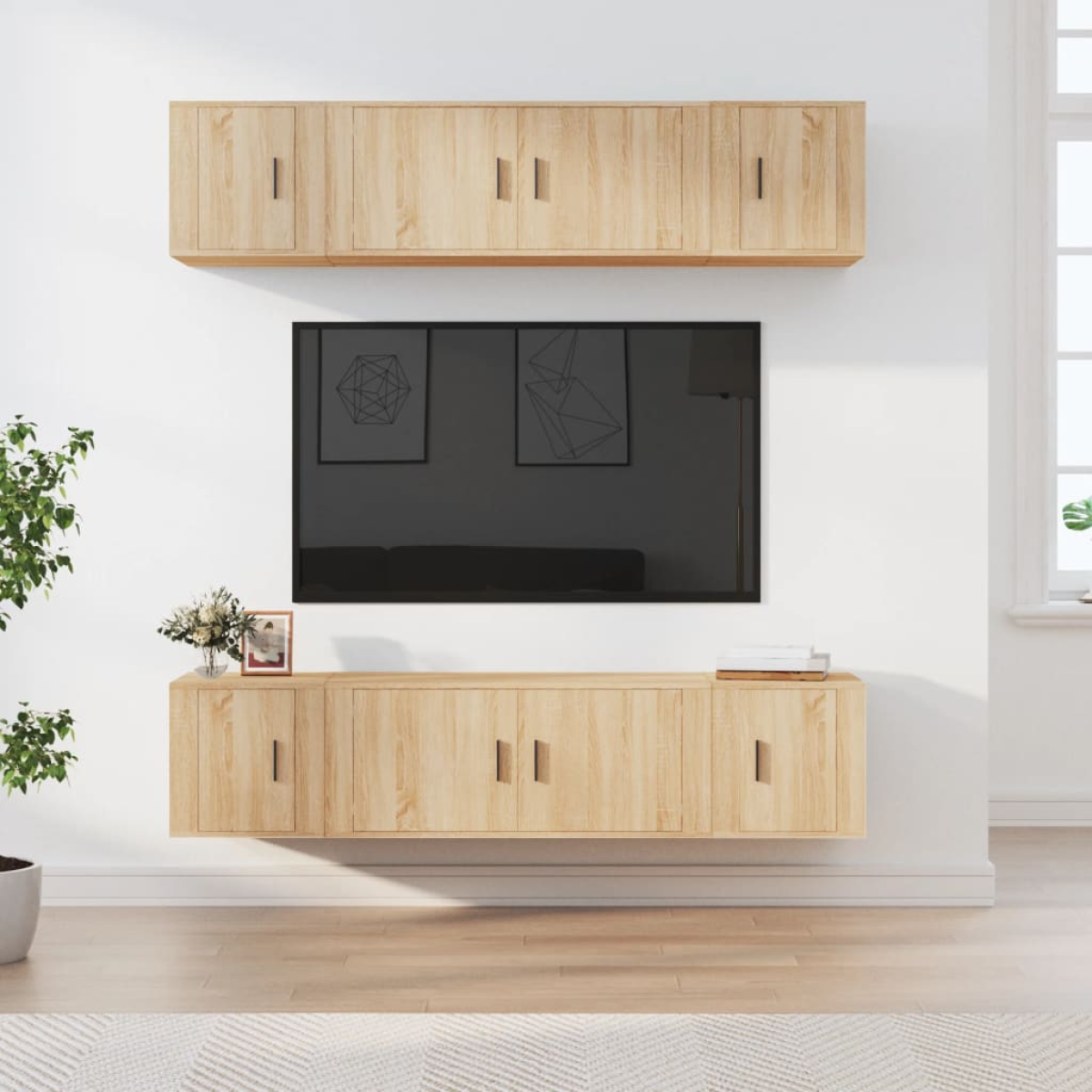 This classic TV cabinet set is designed to be a focal point of your room, featuring a trendy yet practical design. Sturdy material: The engineered wood is of exceptional quality with smooth surface and also features strength, stability and resistance to moisture.Ample storage space: The TV stand set provides ample storage space to keep all your magazines, DVDs and any other items well organised.Wall-mounted design: The TV unit doesn't take up any floor space. You can hang it on the wall easily. Good to know:To make assembly as easy as possible, each product is delivered with a manual.Screws and plugs for inside the wall are not included. We advise to find and use screws and plugs suitable specifically for your walls. If you're not sure, you can consult with a professional. Please read and follow each step of the instructions.
