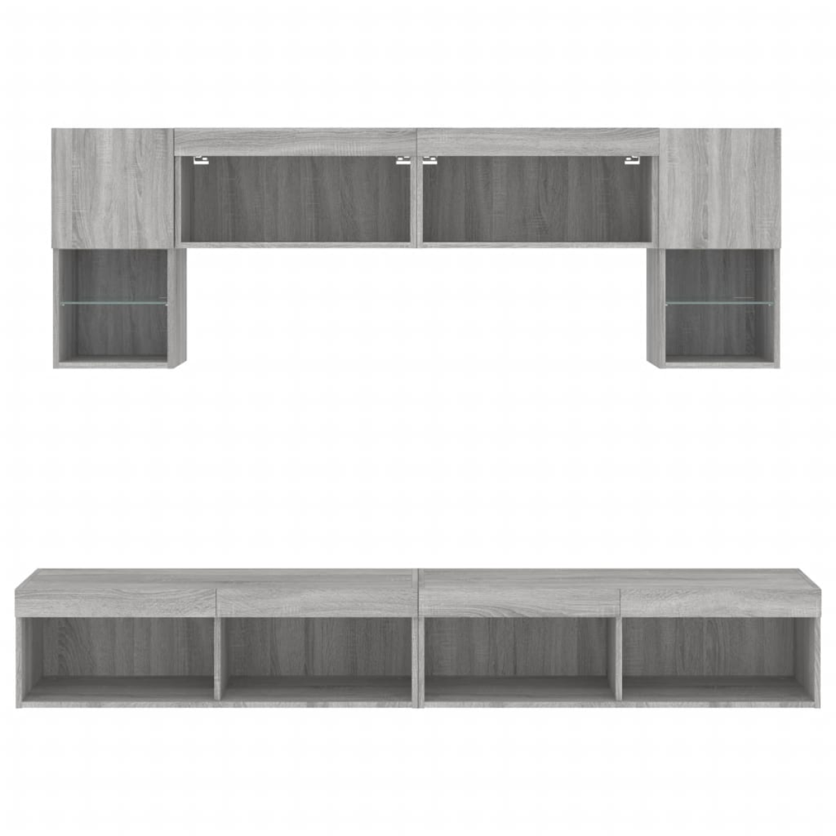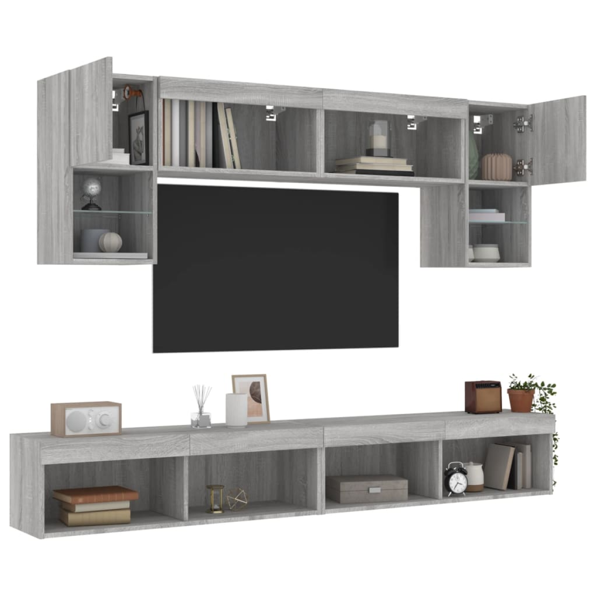 These TV wall units are the perfect solution for your living space to maximise space and keep the floor areas uncluttered. Sturdy material: The engineered wood is of exceptional quality with a smooth surface and also features strength, stability and resistance to moisture.RGB LED lights: The TV unit is equipped with vibrant RGB LED lights. With various customisable menus, you can effortlessly change the colour of the lights and even set them to adjust automatically. These LED lights not only enhance the contemporary look of the floating TV cabinet but also add to its trendy appeal.Wall-mounted design: The television unit can be wall-mounted to add extra storage space. That way, you can maximise your floor space and keep the area clean.Ample storage space: The floating TV unit provides ample space to store your daily essentials such as books, DVDs, magazines, media supplies and other items neatly organised and within easy reach.Versatile design: You can use it as a TV cabinet or mount it on the workplace wall for convenient storage of tools or other miscellaneous items. Also, it transforms an empty wall into a design feature. Good to know:Screws and plugs for inside the wall are not included. We advise to find and use screws and plugs suitable specifically for your walls. If you're not sure, you can consult with a professional. Please read and follow each step of the instructions.The product has a USB connector that requires a certified 5V USB power source (not included).