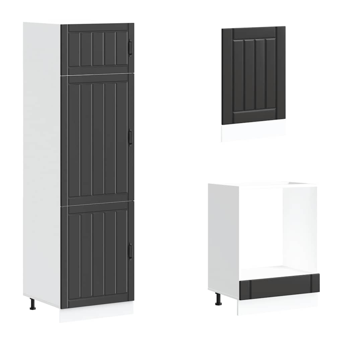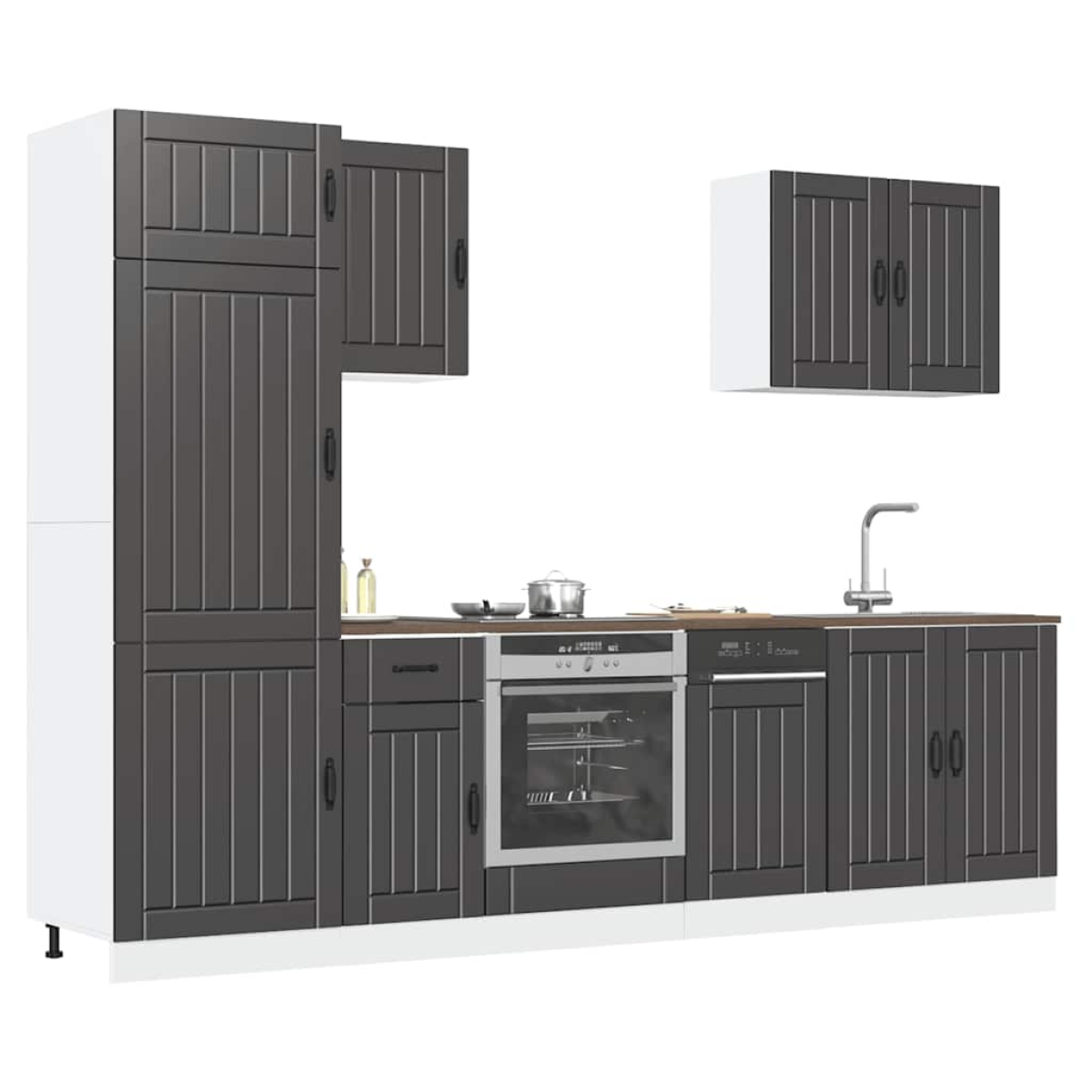 This 7-piece kitchen cabinet set, with its elegant design, optimises your kitchen space and provides ample storage space for your personal belongings! Stable and durable material: Engineered wood is a durable and stable material with a smooth surface that is resistant to moisture, warping, and splitting, making it a reliable choice for a variety of projects.Ample storage space: The kitchen cabinet set has many compartments, and offers sufficient space to store bowls, plates, pots, and other kitchen appliances.Adjustable feet: The bottom cabinets feature adjustable feet that can be adjusted in height to suit your kitchen layout.Easy to maintain: Thanks to its smooth surface, these kitchen cabinets are easy to clean with a damp cloth and require less maintenance. Warning:This product must be secured by installing a worktop. Good to know:Screw(s) and plug(s) for inside the wall are not included. Seek and use screw(s) and plug(s) suitable for your walls. If you are uncertain, seek professional advice. Read and follow each step of the instruction carefully.The worktop, sink and faucet are not included in the delivery.