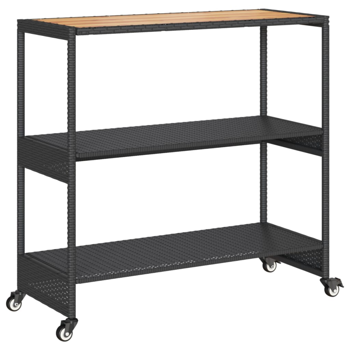 With plenty of storage space, this bar cart is a must-have for parties and home storage! Durable material: PE rattan, also known as poly rattan, is a strong, low-maintenance synthetic material that looks like natural rattan. It's lightweight, easy to clean, and commonly used for outdoor furniture due to its durability and weather-resistant properties.Robust and stable frame: The powder-coated steel frame ensures that the drink trolley is strong and stable for daily use.Ample storage space: This trolley has shelves and comes with an acacia wooden top, providing you with plenty of space to store your drinks or other items.Flexible movement: This kitchen trolley comes with 4 casters that make it easy and convenient to roll it wherever you need it.Wide applications: This bar trolley can be used in indoor or outdoor settings, such as the kitchen, dining room, living room, garden, patio, or poolside, and can be used as a drink cart, kitchen cart, or tea cart.