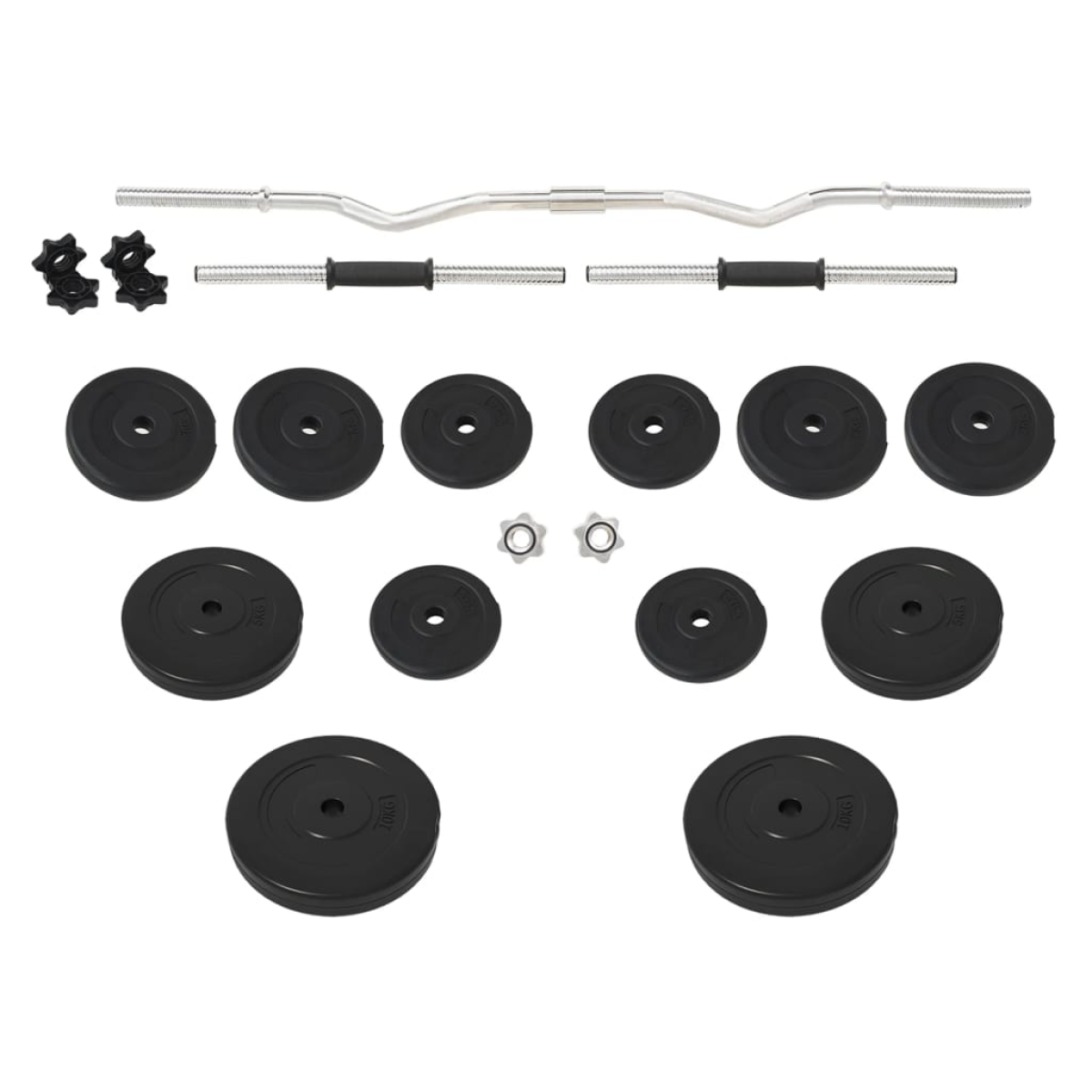 This versatile barbell and dumbbell with plates set is a perfect choice for those who looking for varied workout options. Durable material: Made of steel, the barbell is surely sturdy and stable. Additionally, The barbell plate is made of cement and covered with robust, floor-friendly plastic, allowing you not to experience any annoying clanging sounds of the weights.Different weight set: A suitable combination is easily made with the 4 different weights, 2 x 10 kg, 4 x 5 kg, 4 x 2 kg, 4 x 1,25 kg. The different weight sets always can meet your different training needs.Clearly stamped weight: The weight is clearly stamped on each weight disc for quick and easy identification.Multifunctional dumbbell: The multifunctional barbell set is suitable for training your chest, biceps, arms, triceps, and back muscles.Practical star lock: The star-shaped locks ensure the weights stay in place firmly. Note:Each product comes with an assembly manual in the box for easy assembly.