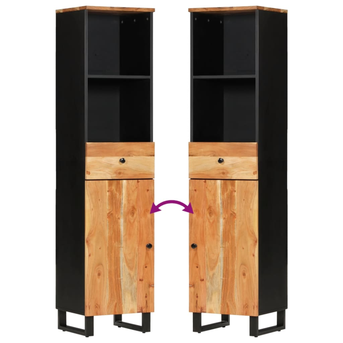 This bathroom cabinet is a great choice for your bathroom, making it tidy and organised! Solid acacia wood: This bathroom cabinet is made of solid acacia wood combined with engineered wood. Solid acacia wood is a beautiful natural material. Acacia wood is a tropical hardwood, which is dense, sturdy, and durable.Ample storage space: The bathroom furniture has 1 drawer, 2 open compartments and 2 compartments with door, offering various storage options and extra space to store items in your bathroom.Stable feet: The iron feet of the bathroom cabinet ensure sturdiness and stability.Flexible door: You can install the door either on the left side or right side based on your own needs. Warning:To prevent it being overturned, this product must be used with the provided wall attachment device. Good to know:Each item is unique with variations in colours and grains. The delivery is random, ensuring the exclusivity and individuality of your product.