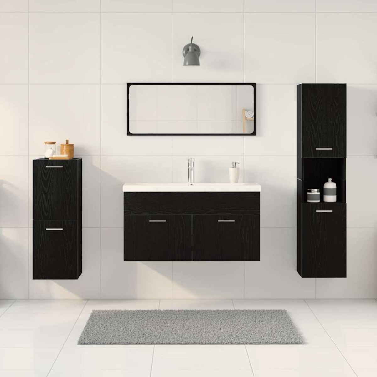 This Modern Bathroom Furniture Set presents a contemporary aesthetic ideal for those seeking simplicity with functionality in their bathroom spaces. Offering a clean and minimalistic vibe, its wall-mounted design increases the available space, making it suitable for various bathroom sizes. The set comprises elements crafted from engineered wood, topped off with sleek silver bars, adding elegance to your bathroom decor. Engineered Wood Material Throughout the set, engineered wood is utilized for its resilience against moisture and wear, ensuring long-lasting service. With a smooth and clean finish, each piece contributes to a cohesive, modern look. Wall-Mounted Convenience This space-saving setup is designed to be wall-mounted, freeing up precious floor space and creating a streamlined look. It's particularly effective in smaller bathrooms, where square footage is at a premium. Modern Design The sleek and functional design of the set is characterized by clean lines and minimal ornamentation, which enhances contemporary bathroom designs and complements various styles. Durable Components Equipped with engineered wood doors and shelves, this robust setup is built to withstand daily usage while retaining an attractive appearance, making it a reliable choice for both family and guest bathrooms. Easy Maintenance Caring for your modern set is simple: wipe with a damp cloth to remove dust and moisture, ensuring your bathroom maintains its pristine appearance with minimal effort.