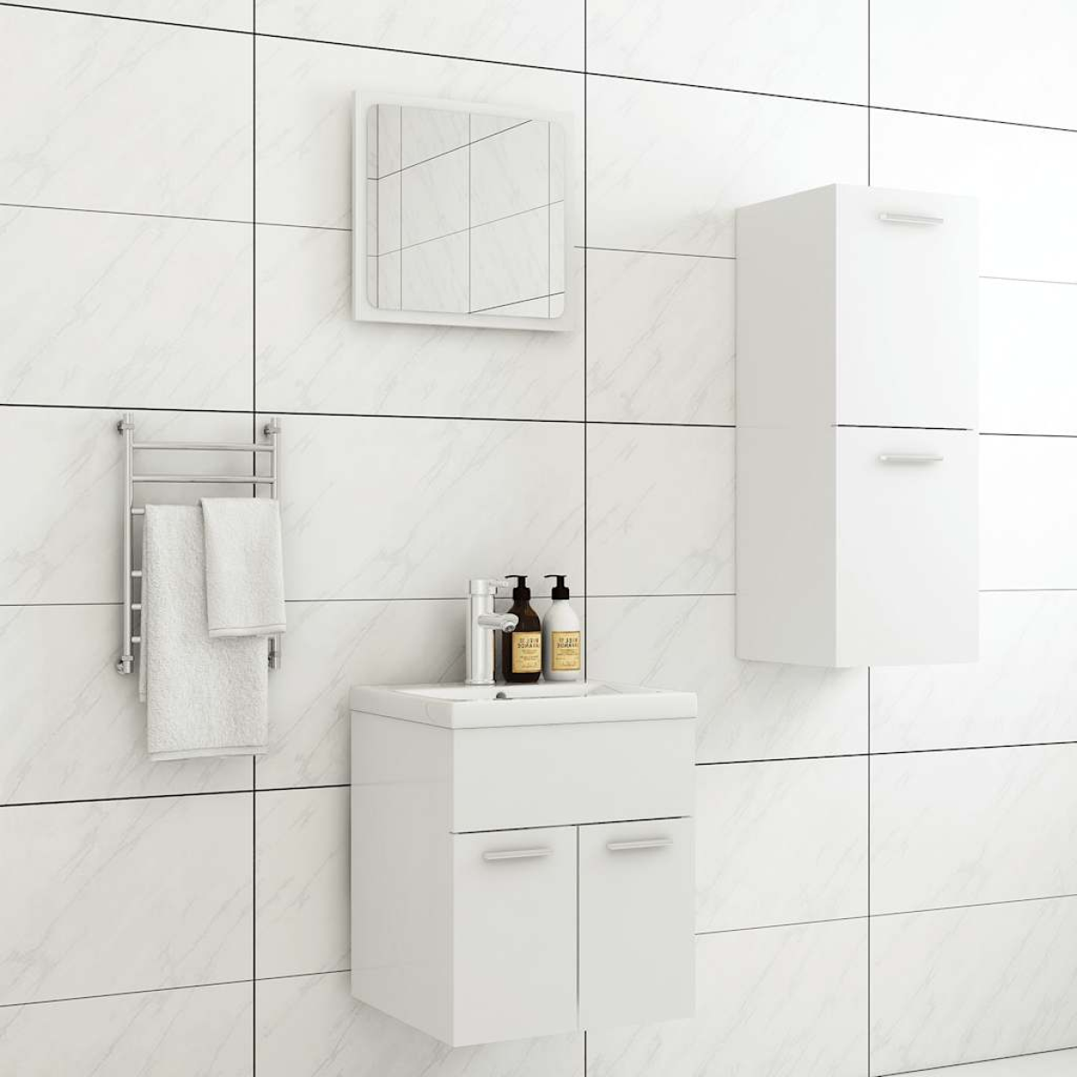 With this stylish bathroom furniture set, you can create additional storage space for your bathroom with a striking, tidy appearance. The clean lines and sleek design blend into your bathroom perfectly. The furniture set consists of a sink cabinet, a low cabinet, and a mirror. The chic basin cabinet has 1 compartment, and the top of it is ideal for placing the sink. The low cabinet features 2 compartments, offering ample space to store items in your bathroom. The mirror also adds an excellent appearance to your home decor. Additionally, this bathroom set is easy to clean with a damp cloth. Please note: The sink, tap, and drain are not included in the delivery.