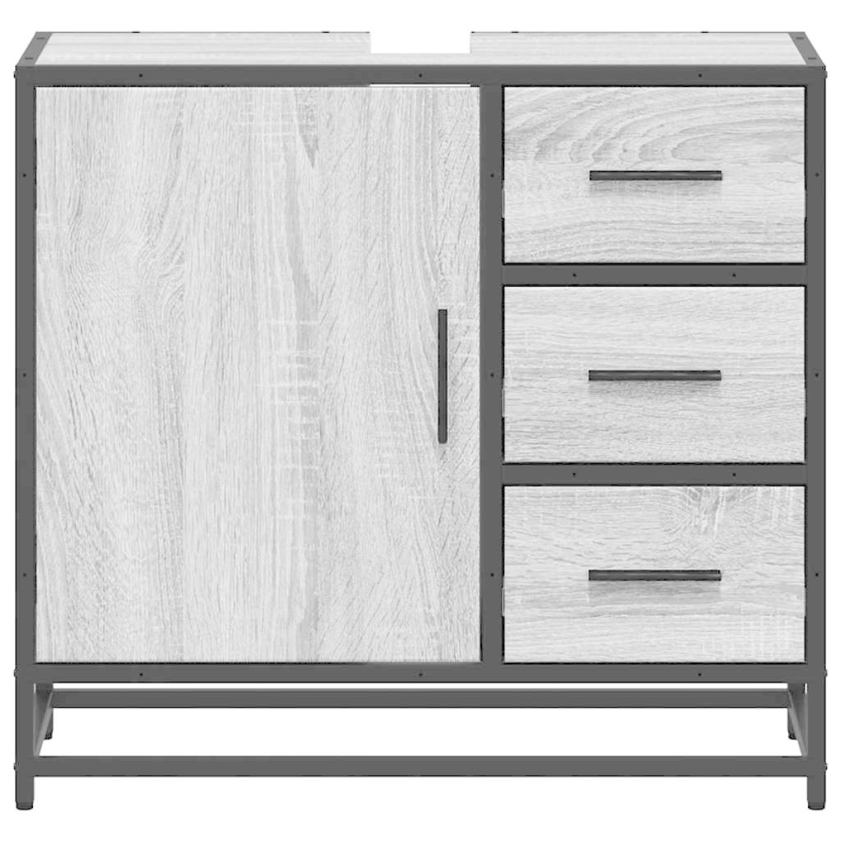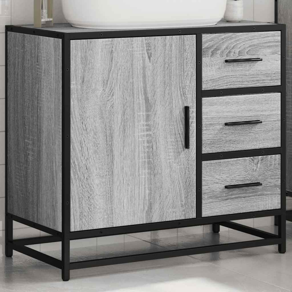 This bathroom sink cabinet is meant to be a great addition to your bathroom, giving it a retro and elegant appearance! Stable and durable material: Engineered wood is a durable and stable material with a smooth surface that is resistant to moisture, warping, and splitting, making it a reliable choice for a variety of projects.Stable and long-lasting frame: The metal frame of the bathroom vanity enhances your interior with an industrial style and provides exceptional durability, stability and resistance to corrosion.Ample storage space: This bathroom furniture offers ample storage space to keep your essentials well organised and within reach.Practical cabinet top: The top of the sink cabinet has a hole, so it is ideal for placing the sink.Attractive appearance: The striking design of the bathroom cabinet enhances the overall look of your space with its smooth lines and sophisticated patterns, making it the highlight of any room. Warning:To prevent it from tipping over, this product must be used with the provided wall attachment device.