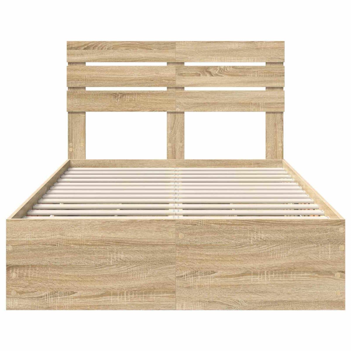 This modern bed frame boasts a sleek, minimalist design ideal for contemporary bedroom spaces. The clean lines and understated elegance provide a chic yet functional focal point for any room. Made exclusively for indoor use, this piece has been crafted from engineered wood, known for its strength and resilience. Perfect for those who value simplicity, this bed frame offers both style and substance, making it an excellent addition to any modern home. Enjoy its straightforward beauty day or night, perfectly complementing your interior decor. Engineered Wood Composition The frame is expertly crafted from high-quality engineered wood, providing robustness and long-term durability. This material not only ensures that the bed retains its form over time but also offers resistance against abrasions, making it an ideal choice for daily use. Its natural wood appearance brings a warm, organic feel to your bedroom, enhancing comfort and coziness. Slatted Frame Design The fixed slatted frame, composed of rigid wood or metal slats, offers superb mattress support. Although offering limited flexibility, it supports your mattress, providing a stable and comfortable sleep surface. The simple yet efficient slat design helps prolong the life of your mattress by allowing air circulation beneath it, minimizing wear and tear. Discrete Storage Solutions With hidden drawers integrated within the bed's structure, this bed frame provides exceptional storage options. These secret compartments, expertly concealed, are perfect for tucking away personal items or keeping your bedroom tidy and clutter-free. The ingenuity of this design adds a layer of functionality to your space without compromising aesthetics. Self-Supporting Structure This bed frame stands independently on the floor without requiring wall fixtures, offering placement versatility. The inclusion of square legs provides stability, making it easy to position and rearrange within your bedroom as needed. The design supports modern living styles, where flexibility and simplicity go hand in hand. Simple Maintenance Maintaining this bed is straightforward, requiring only a quick wipe down with a damp cloth to keep it looking fresh and clean. Whether you want to spend time on style or function, the ease of care ensures your furniture remains beautiful and welcoming throughout its use.