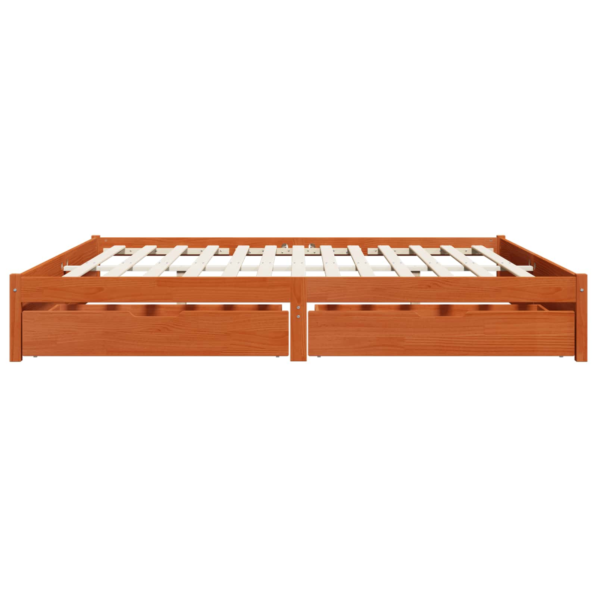 This Wooden Bed Frame elegantly brings together modern design and practical storage, making it a versatile addition to any bedroom. Its minimalist rectangular shape emphasizes simplicity and functionality, while the sleek wax brown finish adds a touch of warmth to the chic aesthetic. Perfect for those looking to optimize their sleeping area, this bed frame offers a convenient solution for uncluttered living, incorporating generous storage space beneath its modern exterior. Quality Solid Pine Wood: The bed frame is crafted entirely from solid pine wood, known for its robustness and longevity. This choice of material ensures a reliable structure that stands the test of time, while its natural aesthetics blend seamlessly with various bedroom decors. The warm undertones in the wax brown finish add a soothing touch to the room. Functional Drawers Included: This bed features two large roll-out drawers under the bed. Each drawer glides out smoothly on roller slides, providing ample space for storing bedding, seasonal clothing, or personal belongings. The storage solution helps maintain a clean, organized living space by keeping items tucked neatly away. Slatted Platform Frame: The platform slatted frame is designed to offer firm and even support for your mattress. The sturdy slats provide a solid foundation without needing a box spring, ensuring comfort and durability while extending the life of your mattress. Effortless Assembly: While assembly is required, the process is straightforward with the help of detailed instructions and a screwdriver. Designed for two people, the easy setup means you'll soon be enjoying your new bed without complications. Care: Keeping the bed frame looking pristine is easy with minimal maintenance. Simply wiping it down with a dry cloth removes dust and dirt, retaining its elegant appearance with effortless care.