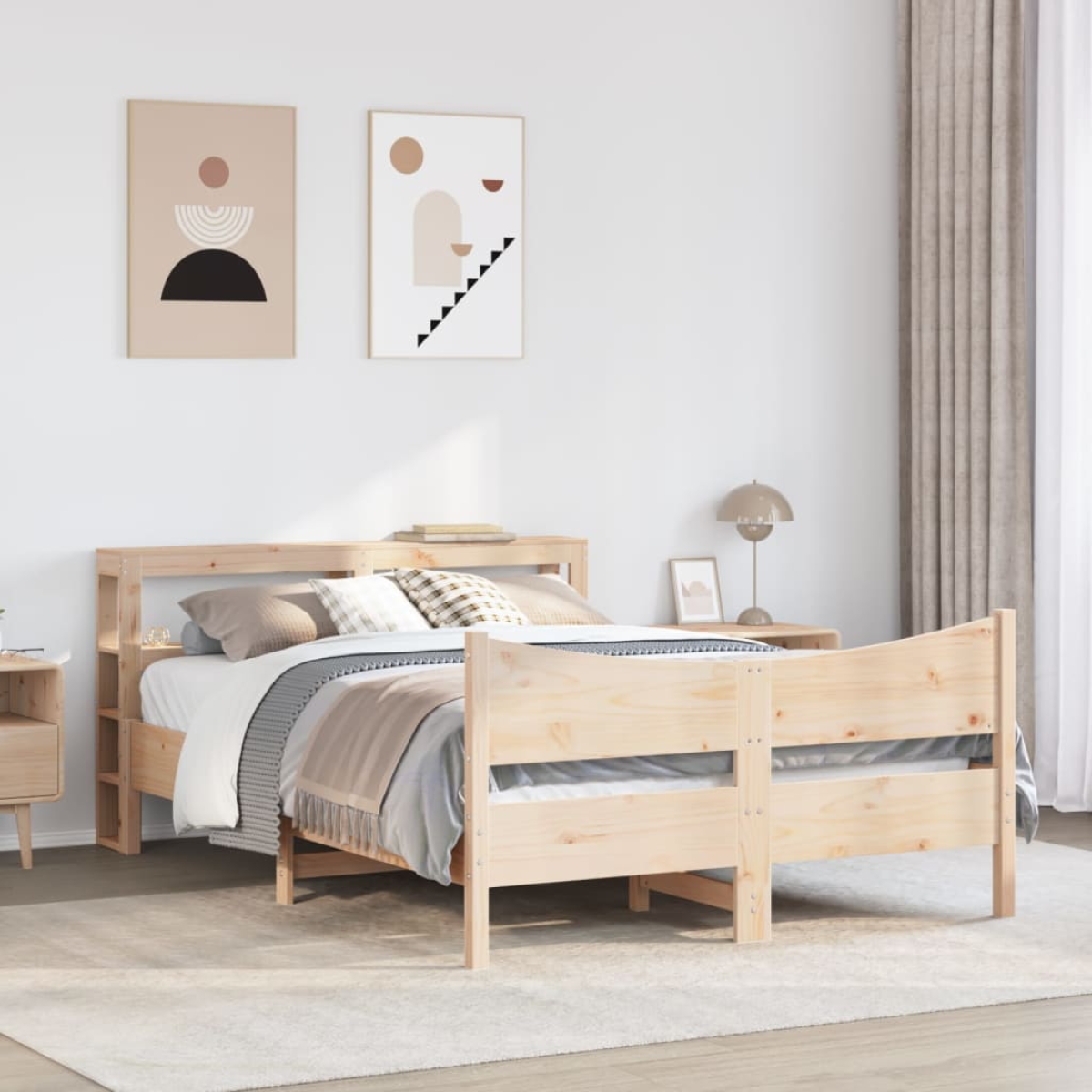Get a better restful night's sleep from this bed frame! It makes a welcoming addition to any bedroom. Stable and long-lasting frame: Solid pinewood is known for its strength and durability. Its straight grains and distinctive knots contribute to its rustic charm.Slatted base for optimal support: The bed frame is equipped with a slatted base for support and breathability for your mattress.Ample storage space: This sleek headboard features two convenient shelves, offering ample storage space to keep all your nighttime essentials within easy reach.Freestanding headboard: The freestanding headboard offers a hassle-free solution for effortless placement and repositioning without the need for wall installation. Good to know:A mattress is not included with this bed. We do offer a various selection of mattresses. You can check our shop for a matching mattress.