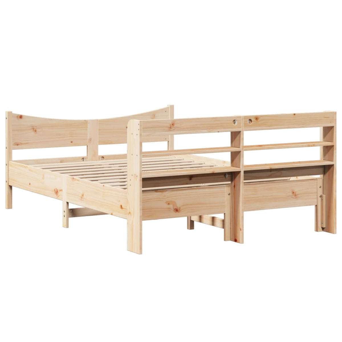 Get a better restful night's sleep from this bed frame! It makes a welcoming addition to any bedroom. Stable and long-lasting frame: Solid pinewood is known for its strength and durability. Its straight grains and distinctive knots contribute to its rustic charm.Slatted base for optimal support: The bed frame is equipped with a slatted base for support and breathability for your mattress.Ample storage space: This sleek headboard features three convenient shelves, offering ample storage space to keep all your nighttime essentials within easy reach.Freestanding headboard: The freestanding headboard offers a hassle-free solution for effortless placement and repositioning without the need for wall installation. Good to know:A mattress is not included with this bed. We do offer a various selection of mattresses. You can check our shop for a matching mattress.