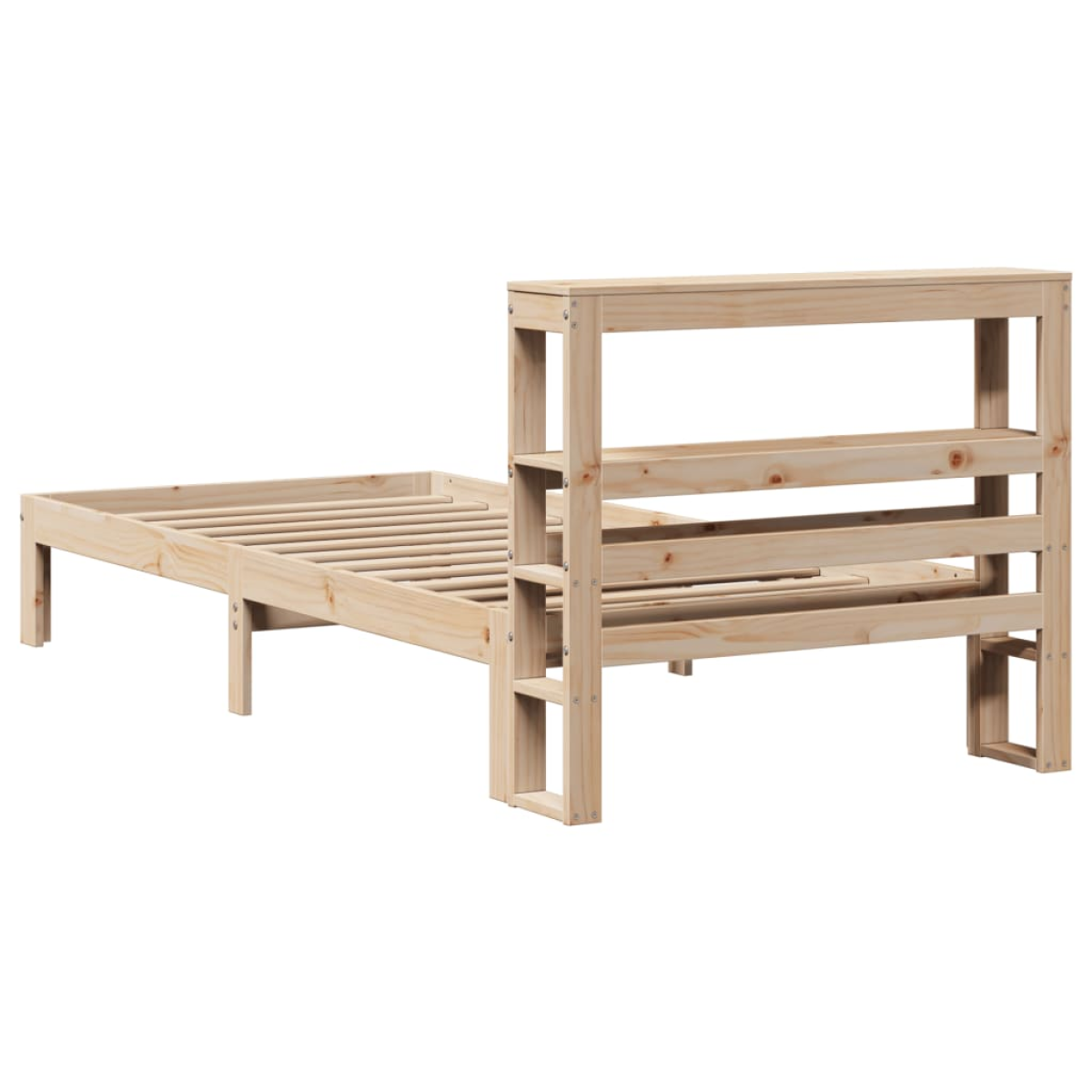 Enjoy a good night's sleep in this wooden bed frame! It makes a practical and decorative addition to your interior. Solid pine wood: Solid pine wood is a beautiful natural material. Pine wood has a straight grain, and the knots give the material its signature, rustic look.Plywood slats: The plywood slats provide good weight distribution, ensuring your mattress with much-needed support and breathability.Ample storage space: This sleek headboard of the bed features two convenient shelves, offering ample storage space to keep all your nighttime essentials within easy reach.Freestanding headboard: The freestanding headboard offers a hassle-free solution for effortless placement and repositioning without the need for wall installation. Good to know: A mattress is not included with this bed. We do offer a various selection of mattresses. You can check our shop for a matching mattress.