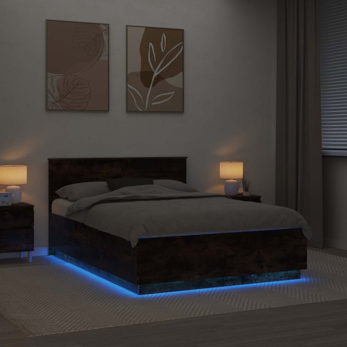 This modern bed frame will transform your bedroom with its sleek and contemporary design. Its frame, precision-crafted from engineered wood, offers a clean, minimalist look perfectly suited for any modern setting. Designed to enhance your sleeping experience, the bed features an adjustable headboard and calming LED strip lights for a beautifully illuminated backdrop –setting a delightful mood for relaxation. Materials: The bed frame is constructed from high-quality engineered wood, known for its strength and resistance to warping. This material choice ensures a consistent appearance and integrity, enhancing the modern aesthetic of your bedroom while providing stability and durability. Included Components: The bed comes complete with an adjustable, wall-mounted headboard that provides customizable support and an integrated storage solution. LED strip lights enhance the frame, offering ambient lighting options, while a handy USB plug allows for device charging right from the comfort of your bed. Features /Function /Design: An adjustable headboard provides personalized comfort, supporting various sitting positions for reading or relaxing. The USB port supports convenient gadget charging without messy cables, while multicolor LED lights add a touch of elegance and personalization to your space. Recommended Uses: Perfect for modern, minimalist bedroom settings, this bed frame's stylish appearance can transform any bedroom into a contemporary haven. Its adaptability makes it suitable for tech-savvy users who appreciate integrated electronics and a versatile sleeping environment. Care &Maintenance: To maintain the bed’s pristine look, simply wipe down with a damp cloth. This straightforward care requirement ensures the bed remains a visually appealing centerpiece while extending its lifespan.