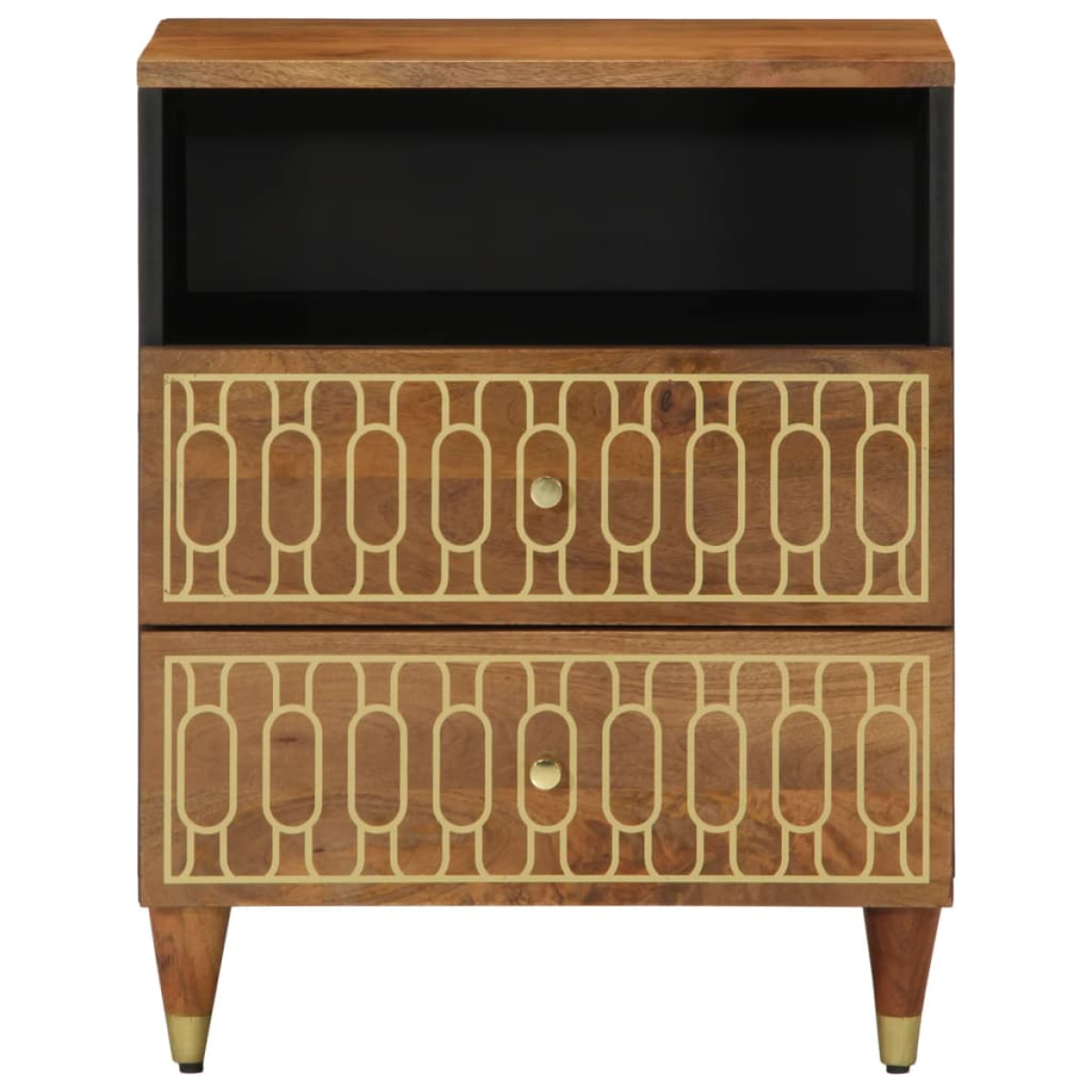 This bedside cabinet with an elegant design makes a timeless addition to your interior decor. Solid mango wood: Solid mango wood is a strong, tropical hardwood that makes sturdy furniture. Its beautiful wood grains make every piece of furniture slightly different from the next. Made of solid mango wood, the cabinet is durable and stable.Ample storage space: The bedside table is designed with 2 drawers and 1 compartment to keep things organised and within easy reach.Stable top: The top of the side cabinet is perfect for displaying your decorative items, picture frames and potted plants.Sturdy legs: The iron legs add to the bedroom furniture's sturdiness and stability.Retro style: This bed side cabinet with hand-carved floral patterns brings the luxury of retro style to your interior, being the focal point of your room. Good to know:Each item is unique with variations in colours and grains. The delivery is random, ensuring the exclusivity and individuality of your product. Warning:To prevent it from tipping over, this product must be used with the provided wall attachment device.