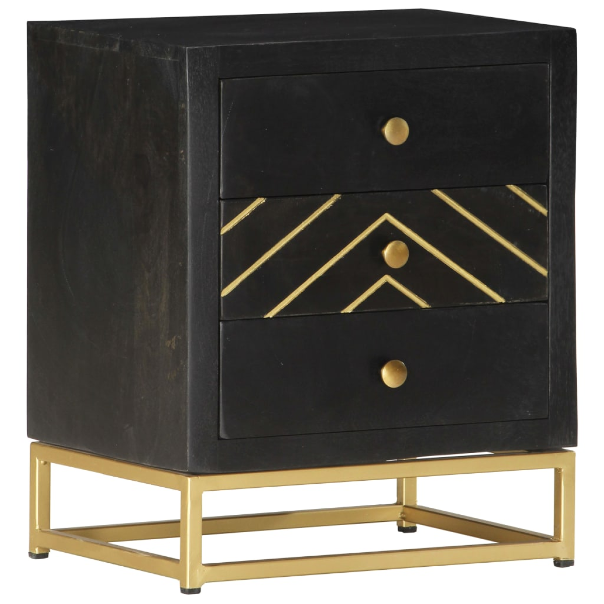 Our wooden bedside cabinet features a balck and gold finish and will be a decorative addition to your bedroom. The nightstand is handmade of mango wood which is solid, stable, durable and beautiful, and the craftsmanship adds to its spectacular retro style. Every step of the process is carried out with the greatest care, be it polishing, painting or lacquering. The craftsmanship and the beautiful wood grains make every piece of furniture unique and slightly different from the next. Besides, it has a sturdy top and three drawers which provide enough space for you to keep various items such as books, glasses, remotes, etc. neatly organised and within reach. This item is easy to assemble. Important note: The colours vary from piece to piece, making each piece unique and slightly different from the next. The delivery is random, ensuring the exclusivity and individuality of your product.