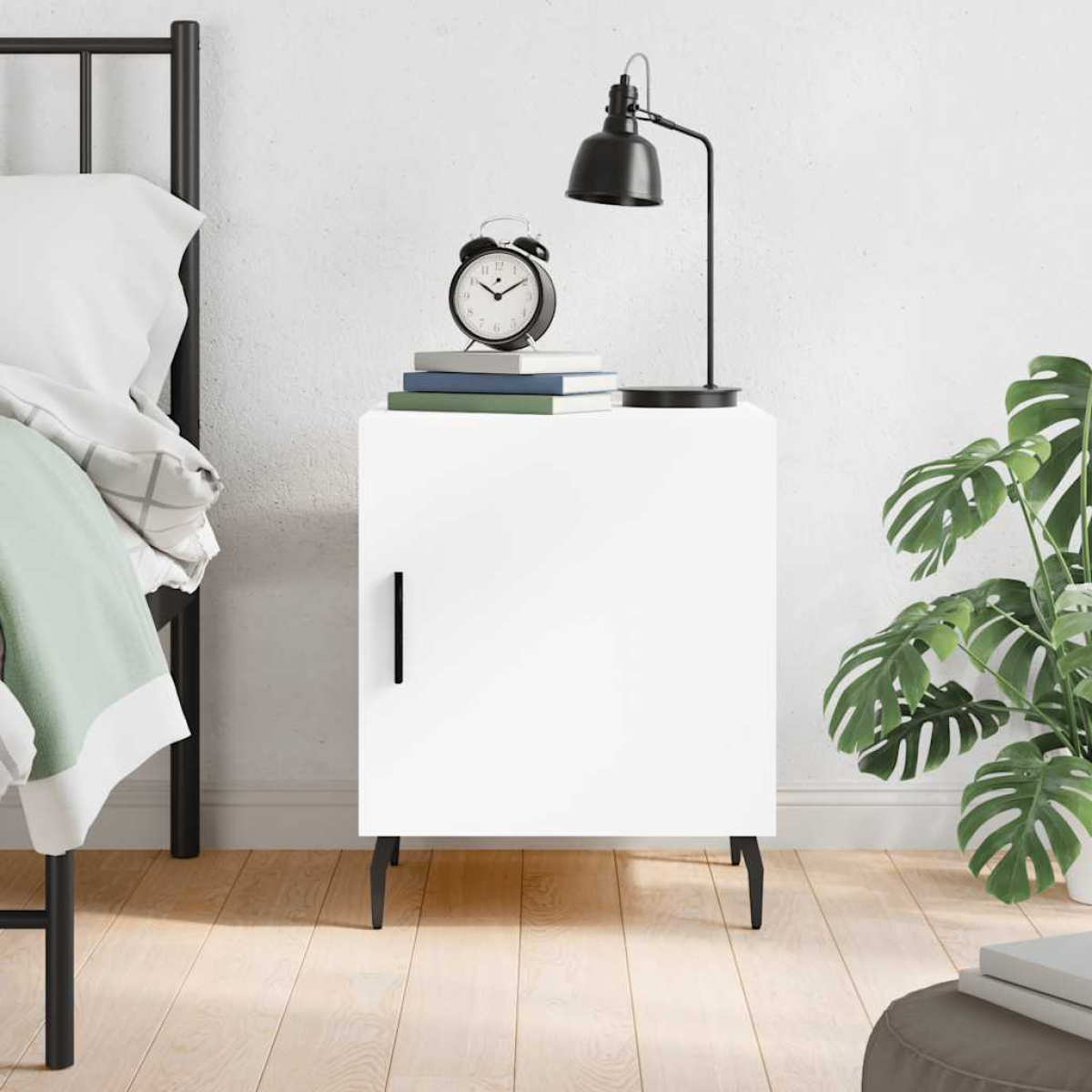 Introduce an air of modern charm to your interior with this bedside cabinet! Durable material: The engineered wood is of exceptional quality with smooth surface and also features strength, stability and resistance to moisture. Spacious storage space: The bedside cabinet has a compartment, providing spacious storage space to keep your books, multimedia appliances and other items within reach.Displaying function: You can also place your favourite photos, decorations or flowers on top of the side cabinet to enrich your life. Metal feet: The metal feet add a calm style to your interior while ensuring stability.Practical door: Keep your essentials free from dust by hiding them behind the door. Warning: To prevent it being overturned, this product must be used with the provided wall attachment device.