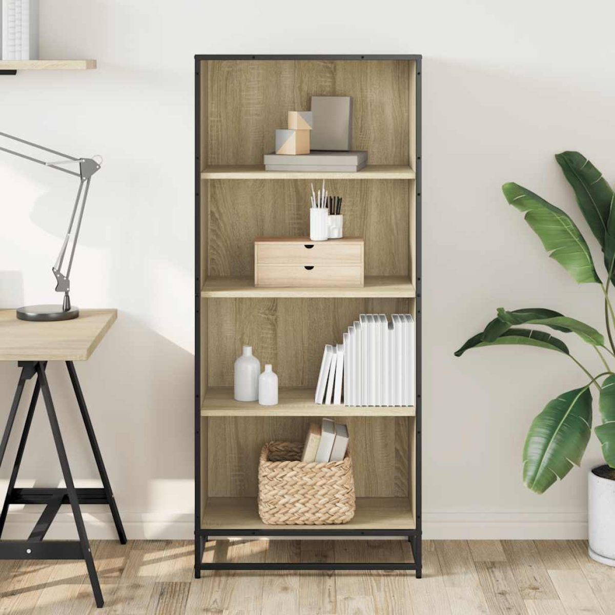This bookcase provides an ideal solution for organising your books and will add a touch of modern charm to your interior. Stable and durable material: Engineered wood is a durable and stable material with a smooth surface that is resistant to moisture, warping, and splitting, making it a reliable choice for a variety of projects.Stable and long-lasting frame: The metal frame of the bookshelf enhances your interior with an industrial style and provides exceptional durability, stability and resistance to corrosion.Ample storage space: This book case provides ample storage space for keeping your magazines, books, DVDs, and multimedia devices well-organised and within reach.Wide applications: This storage shelf is versatile and suitable for bedrooms, living rooms, hallways, and so on for your needs.Easy to maintain: Thanks to its smooth surface, the storage cabinet is easy to clean with a damp cloth and requires less maintenance. Warning:To prevent it from tipping over, this product must be used with the provided wall attachment device.