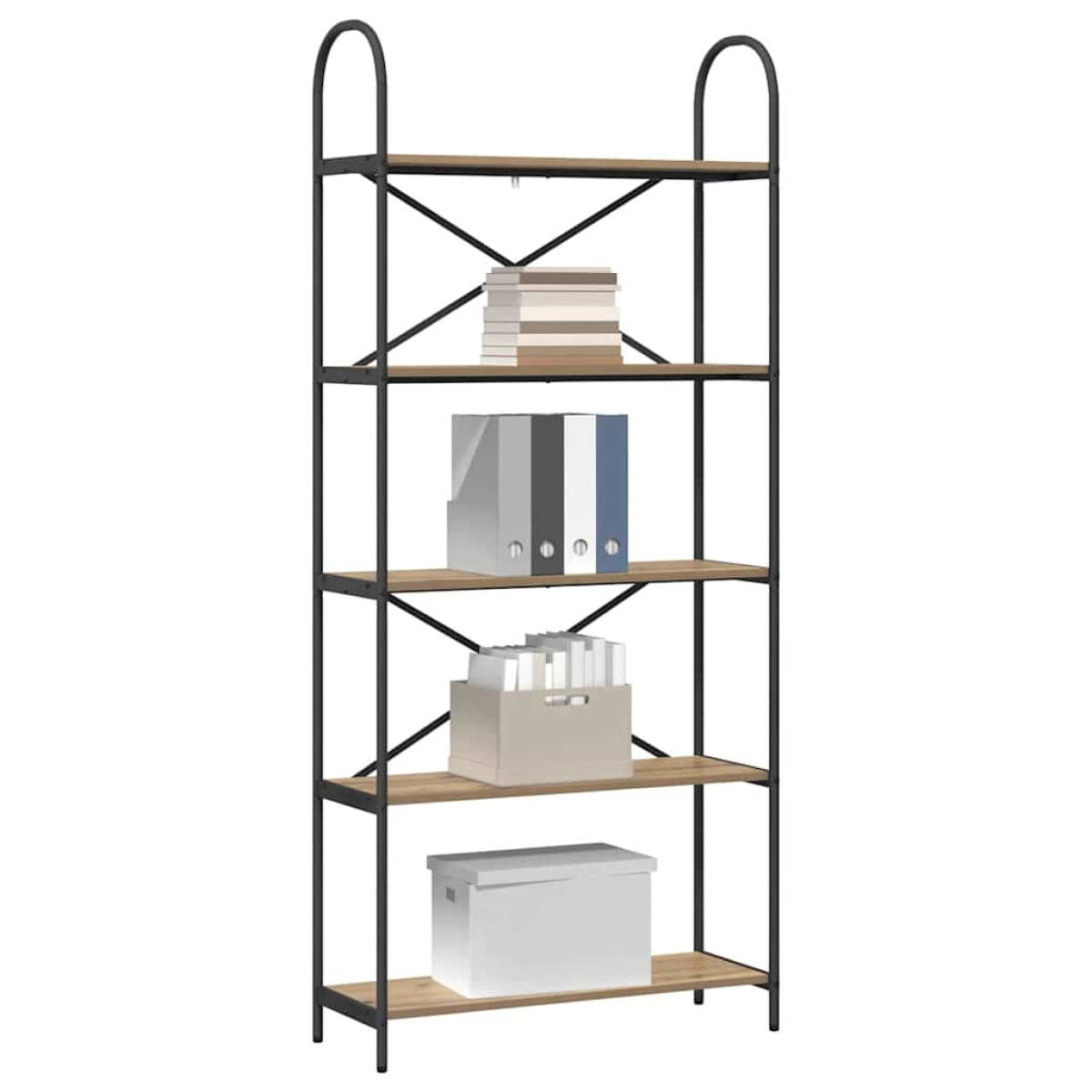 This modern rectangular bookshelf is a freestanding storage unit that combines style and organization, perfect for displaying your books, decorative items, and more. With clean lines and a minimalistic design, this bookshelf fits seamlessly into any contemporary home setting. Its engineered wood shelves and black steel frame provide a sleek, sophisticated look, ensuring it becomes a focal point in your living space. Whether you place it in your living room or study, this bookshelf is designed to elevate the ambiance with its understated elegance. Engineered Wood Shelves Featuring engineered wood shelves, this bookshelf offers a durable and environmentally friendly solution for your storage needs. The material’s smooth surface and sturdy structure ensure that your books and decor are always supported. With its moisture-resistant properties, engineered wood maintains its beauty and functionality over time. Steel Frame Structure The sleek black steel frame of the bookshelf not only enhances its modern aesthetic but also provides exceptional stability and weight-bearing capacity. This robust frame minimizes wobble, offering a reliable place for your treasured items. Rectangular Shape &Design: The bookshelf’s rectangular shape makes it a versatile addition to any room. Its simple, straightforward design allows it to complement various interior styles, from industrial lofts to contemporary apartments. It's an ideal piece for those seeking elegance without excess. Ample Storage Space Designed with multiple shelving units, this bookshelf provides ample space to store and organize your books, picture frames, and decorative items. Its open design ensures easy access and a clutter-free environment, making it a practical addition to your home. Simple Assembly: With the tools included, you can set up this bookshelf quickly. The straightforward instructions guide you through the assembly, requiring only basic tools and two people to complete the task, ensuring your new bookshelf is ready to display your favorite items without unnecessary hassle.