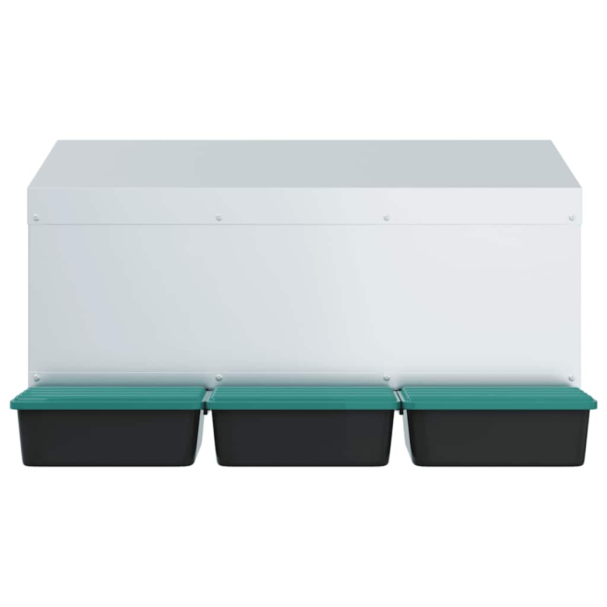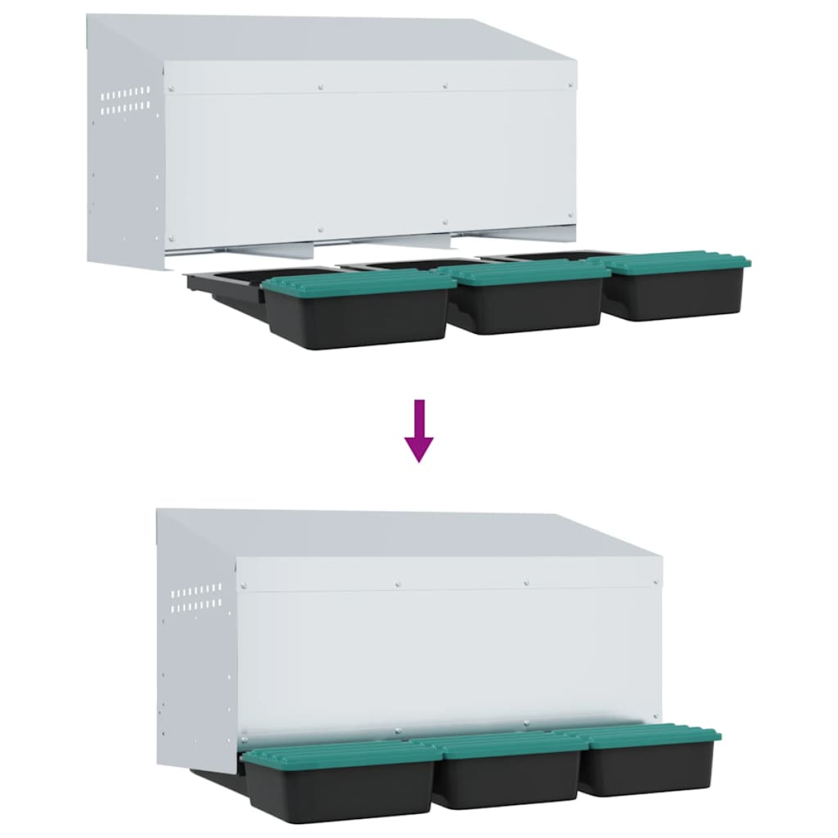 Upgrade your poultry farming experience with the chicken nesting box, providing hens with private, comfortable laying space. Robust and durable material: Crafted from galvanised steel and sturdy polypropylene plastic, this nesting box is built to last, offering long-lasting performance and protection for your chickens against harsh outdoor conditions.Convenient egg collection: The easy-lift lid and roll-out design allow for effortless egg collection while keeping the chickens undisturbed. The thoughtful design promotes a calm environment for your flock, making egg collection smooth, hassle-free, and easy to maintain.Effortless installation: Designed with an open front that seamlessly integrates into wall cut-outs, the nesting box offers easy access for hens while maintaining a tidy, space-saving setup. Ideal for wooden walls with pre-prepared cut-outs, it ensures quick and secure installation with minimal effort.Protected laying space for chickens: With its relatively enclosed design, this chicken nesting box encourages hens to lay eggs comfortably, reducing the risk of eggs being laid outside the box. It offers a dark, clean retreat for undisturbed egg laying—an ideal accessory for any chicken coop or chicken house.Easy to clean: The tray is easily removable for cleaning, and the smooth surfaces of both the tray and the box make cleaning effortless, promoting a cleaner and more hygienic environment for your chickens. Good to know:To avoid scratches, it is recommended to wear gloves during installation.The product is suitable for mounting on wooden walls.