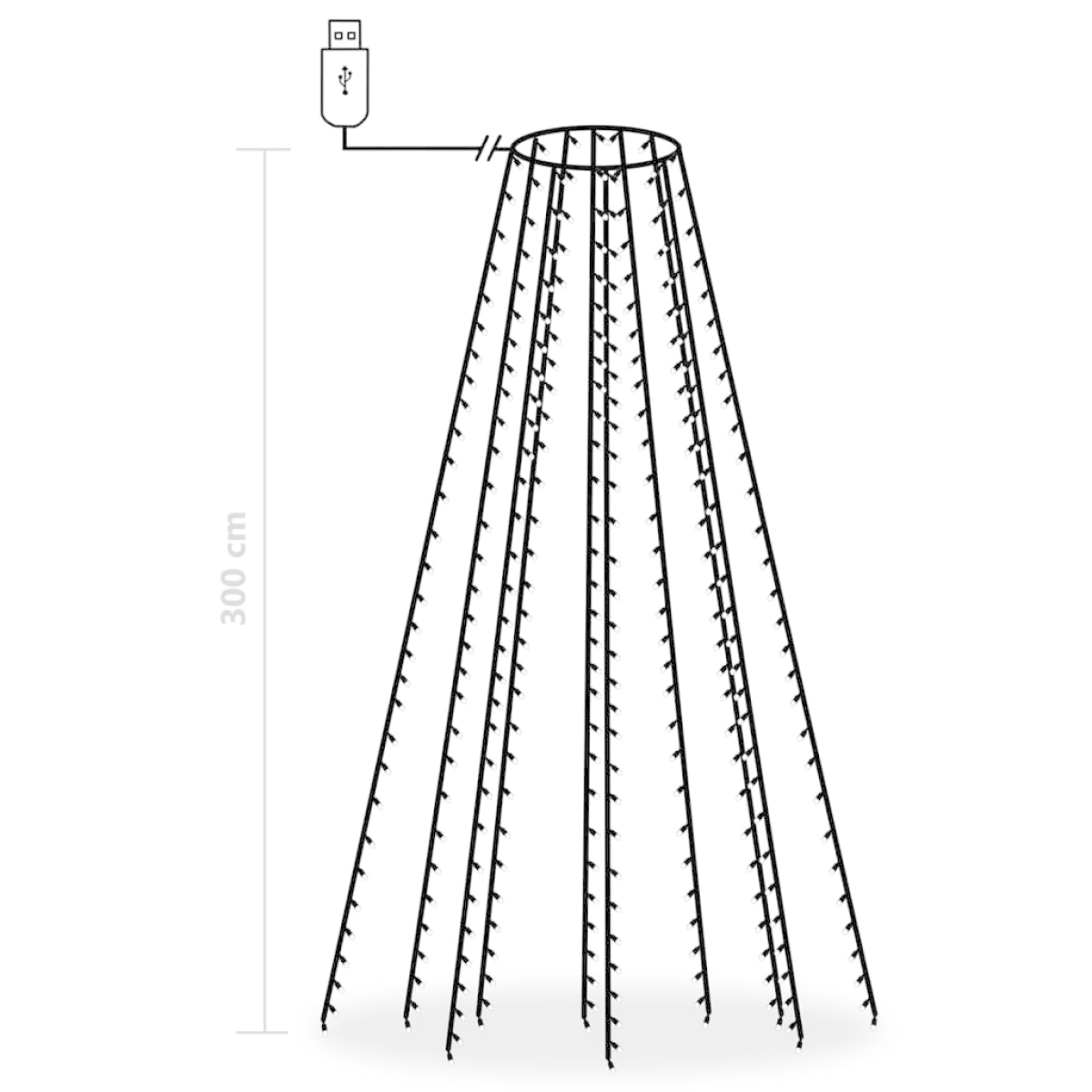 These LED lights are specifically designed for decorating your Christmas tree and creates a nice atmosphere. The lights consist of 300 LEDs, which are very energy efficient and emit a bright light. This lovely Christmas decoration is waterproof and therefore suitable for both indoor and outdoor use. You could easily place this decoration onto the top of your Christmas tree, and its light strings will naturally drape to the floor. The light is a real eye-catcher, especially in the evening, and they also serve as a cosy source of ambient light. While not in use, these LED lights can be easily stored for next holiday's use. Have fun during your holiday with these LED tree lights! Please note that the Christmas tree and baubles are not included in delivery. Note: The product has a USB connector, but the certified 5V USB power source is not included.