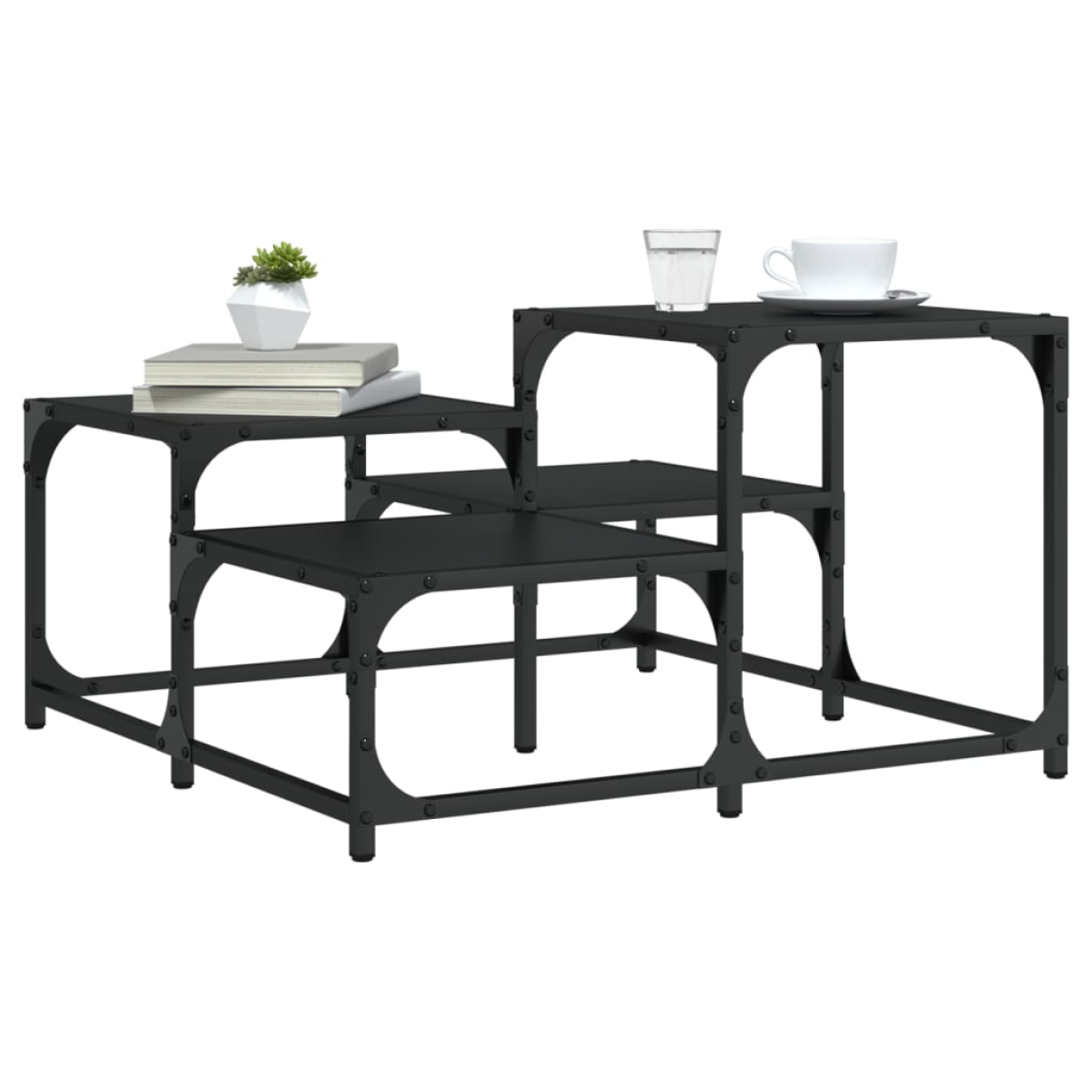 Decorate your living room with this stylish coffee table, it easily blends with furniture in any style at your house. Durable material: The engineered wood is of exceptional quality with smooth surface and also features strength, stability and resistance to moisture. Made of engineered wood, the sofa table is easy to clean.Displaying function: This square coffee table consists of different height tops, which ensures that each leaf can contain its own decoration.Sturdy top: The sturdy tabletop of the couch table is ideal for placing your drinks or any other necessities you need close at hand.Metal frame: The metal frame adds an industrial style to your interior while ensuring durability and stability.Adjustable feet: The adjustable feet with plastic pads keep the centre table balanced on uneven ground and increase stability.