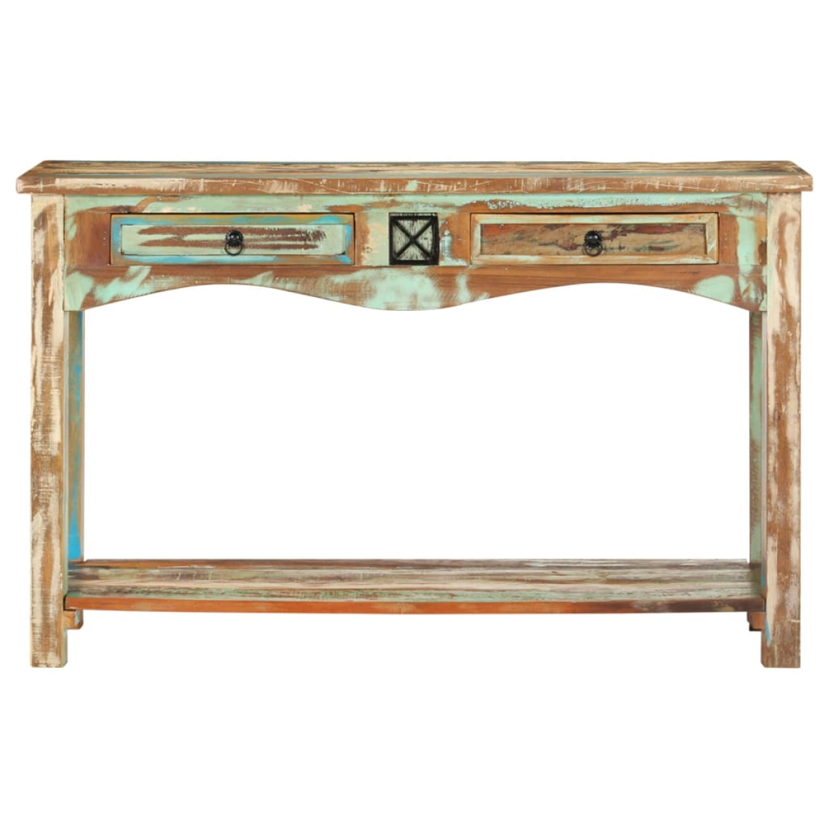 This wooden console table exudes a vintage charm and will be the centre of attraction for your interior. This retro console cabinet is made of solid reclaimed wood that has been sourced from joists, floors and support beams from old buildings being demolished, and it can consist of different types of wood like pine, teak, beech, oak, cedar, mango wood, acacia, etc. This means the reclaimed wood retains the characteristics of these different types of wood. Reclaimed wood is already aged, weathered and dried, so it doesn't shrink or bend. Accordingly, this beautifully-designed side cabinet is exceedingly stable, durable and eye-catching. Additionally, the exquisite craftsmanship and the graceful wood grains make every piece of furniture distinctive and slightly different from the next. Besides, this hall cabinet features 2 drawers and 1 shelf, providing ample space for storing your multimedia devices, books, as well as various other items. Important note: The wood grains vary from piece to piece, making each piece unique. The delivery is random, ensuring the exclusivity and individuality of your product.