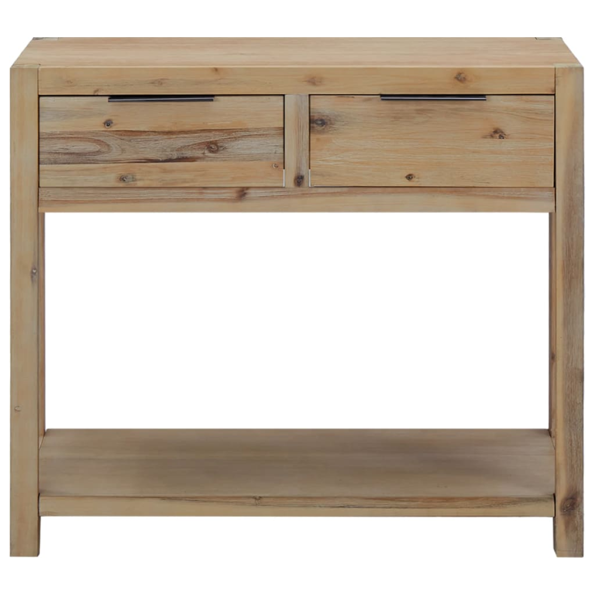 This console table will add a touch of rustic charm to your interior. This console table is made of solid acacia wood with a brushed finish, MDF and acacia veneer, which makes it sturdy and stable.The console table has a sturdy top, on which you can place decorative items like fruit baskets or vases. The shelf and 2 drawers provide ample space for keeping all kinds of smaller items organised and within reach. This product needs assembly.