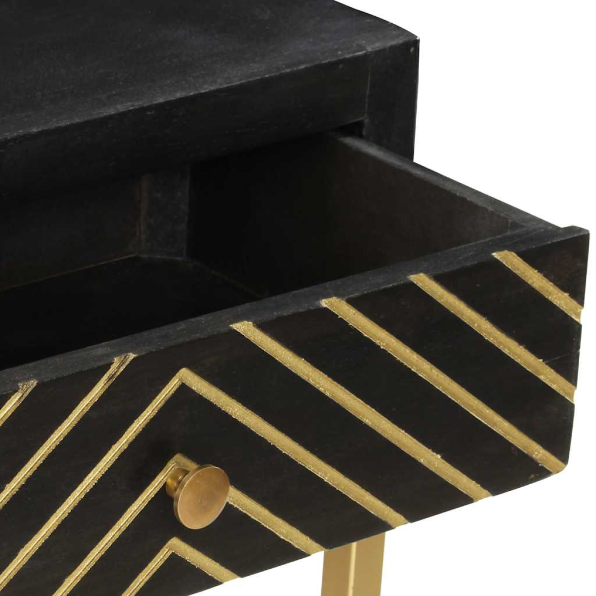 Our wooden console table features a black and gold finish and will make a timeless addition to your interior. The table is made of solid mango and sturdy steel and is highly durable. Mango wood is a tropical hardwood with the strength to bear the weight and it also stands the wear and tear of time, making it stable and durable. The sturdy top is ideal for placing some decorative items like vases or potted plants. The 2 drawers provide ample storage space for keeping various items neatly organised. The steel frame gives the table an industrial touch. Every step of the construction process is carried out with the greatest care, be it polishing, painting, or lacquering. The console table is easy to assemble. Important note: The colours vary from piece to piece, making each piece unique and slightly different from the next. The delivery is random, ensuring the exclusivity and individuality of your product.