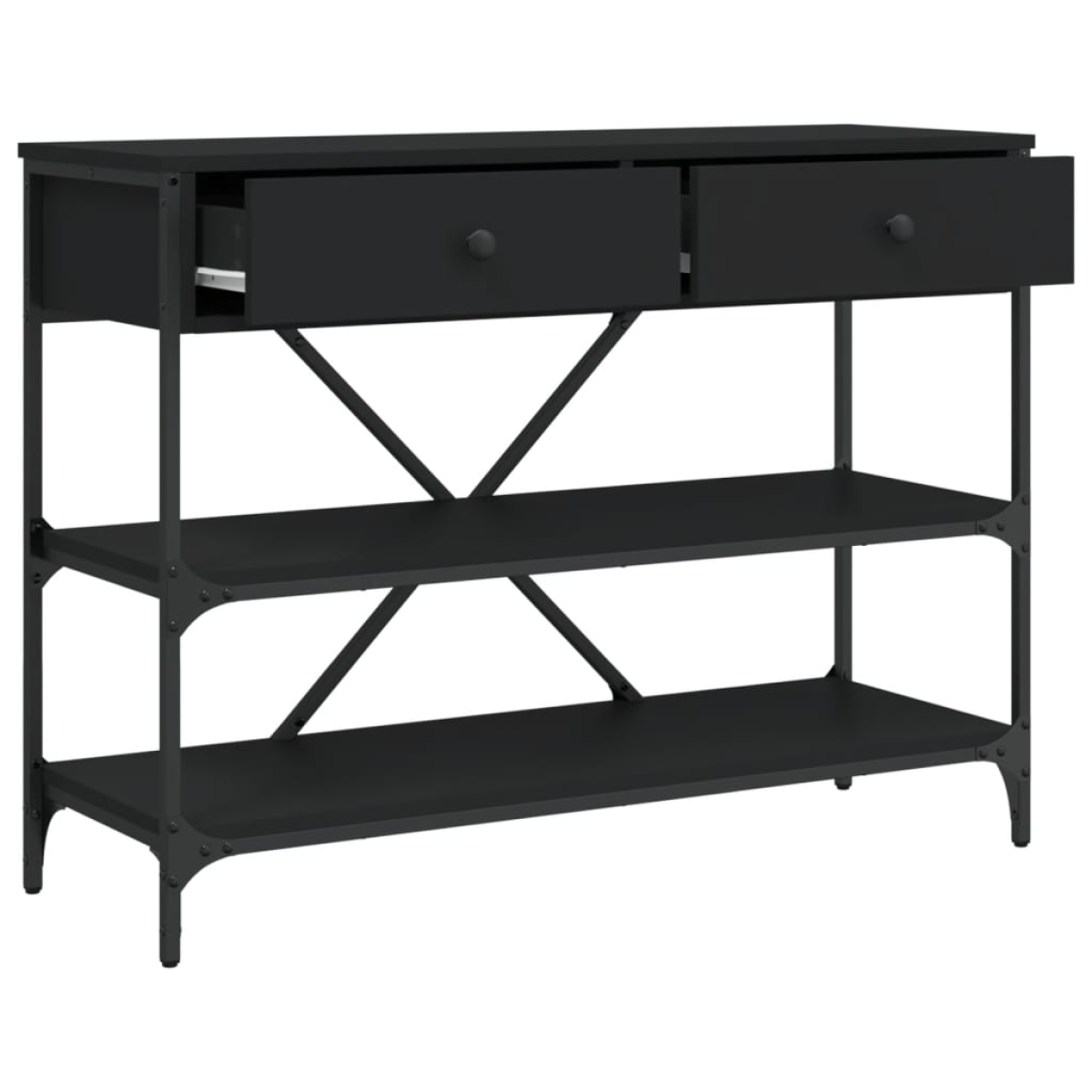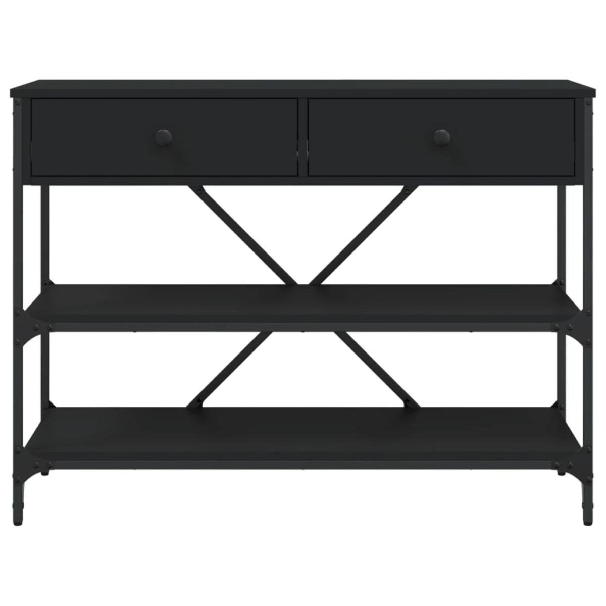 This classic console table will make a practical and decorative addition to your home decor. Durable material: The engineered wood is of exceptional quality with smooth surface and also features strength, stability and resistance to moisture.Sturdy frame: The sofa table is constructed with a robust steel frame. Steel is an exceptionally hard and strong material. It offers sturdiness and stability. Ample storage space: This practical hall table has 2 drawers and 2 bottom shelves, providing ample space for keeping your books, plants, storage boxes, decorations, etc.Displaying function: You can also place your favourite photos, decorations, or flowers on top of the side table to enrich your life. Warning:To prevent it being overturned, this product must be used with the provided wall attachment device.