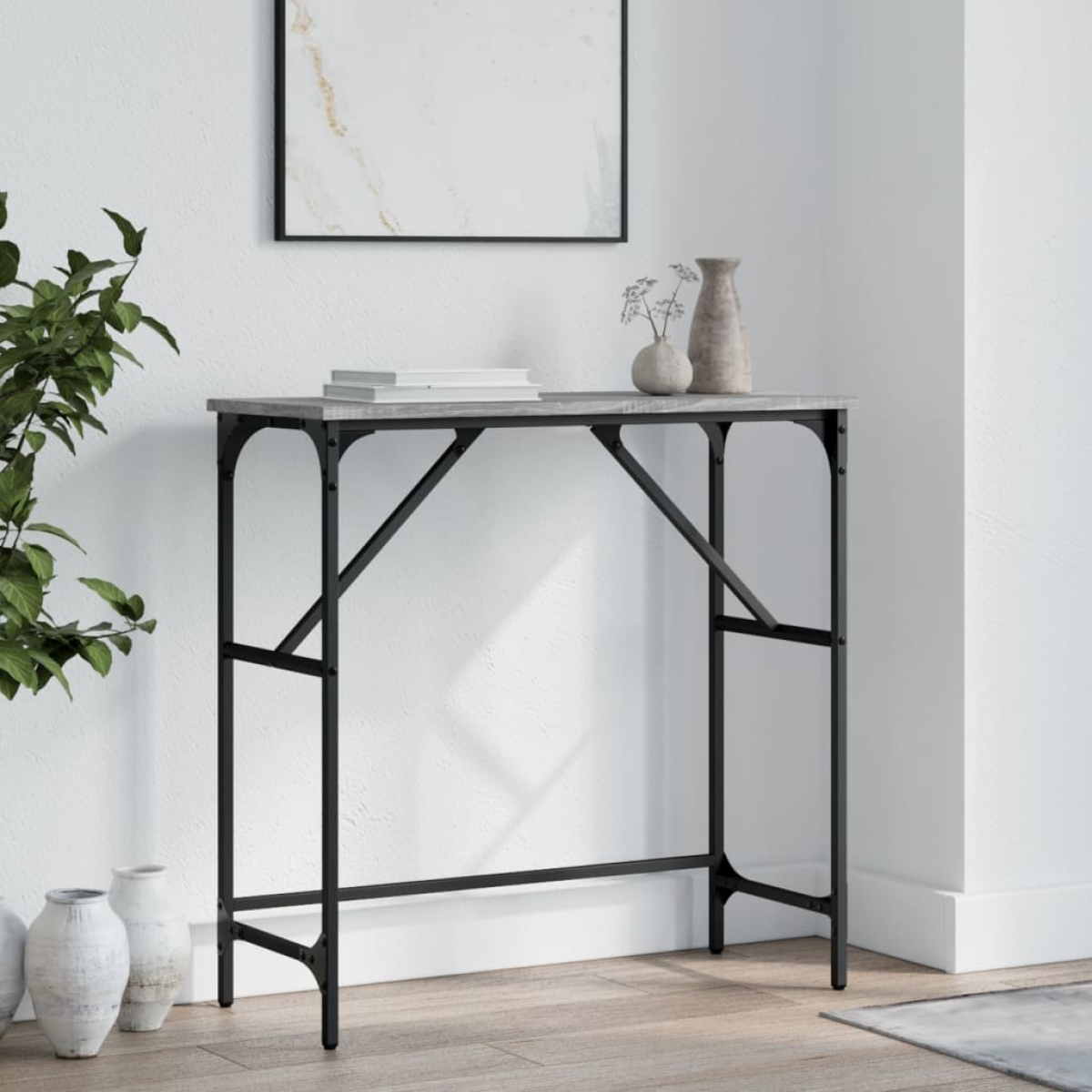 Add a touch of elegance to your entryway, living room, or hallway with this stylish console table. Durable material: The engineered wood is of exceptional quality with smooth surface and also features strength, stability and resistance to moisture. Made of engineered wood, the sofa table is easy to clean.Sturdy tabletop: The sturdy tabletop of the hall table is perfect for placing your framed photos, potted plants, and other decorative items.Adjustable feet: Four adjustable feet with plastic pads keep the hallway table balanced on uneven ground and increase stability.Metal frame: The metal frame adds an industrial style to your interior while ensuring durability and stability. Warning:To prevent it being overturned, this product must be used with the provided wall attachment device.