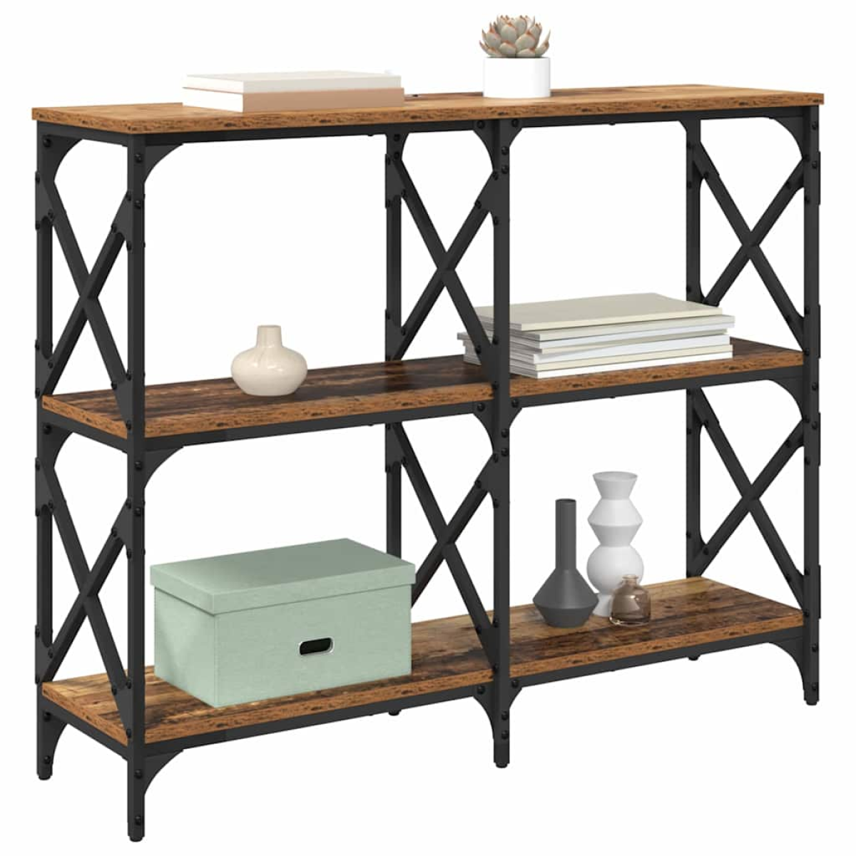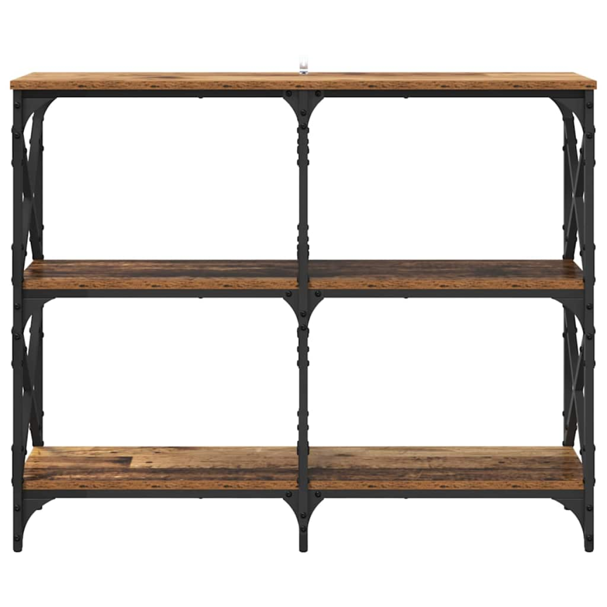 This Engineered Wood Console Table combines rustic charm with functional design, perfect for enhancing any living room. Ideal for displaying decorative items while offering ample storage, it features a smooth, opaque rectangular surface and board shelves made from engineered wood. Its sturdy metal frame and post legs provide reliable support, making it a versatile addition to hallways, entryways, or living areas. Materials: The console table is crafted from engineered wood, known for its strength and smooth finish. It resists stains, ensuring the table retains its beauty even with regular use. The opaque surface complements various interior styles, adding a touch of rustic elegance to your living space. Included Components: The table features board shelves that offer straightforward storage options. These shelves are made from engineered wood, providing a basic yet reliable shelving solution for your items. Paired with steel post legs, the table ensures robustness and stable support. Features /Function /Design: Equipped with adjustable feet, this console table accommodates uneven surfaces, ensuring stability. Its rectangular shape and smooth texture make it a fitting choice for a narrow hallway or a spacious living room, blending effortlessly with existing décor. Recommended Uses: Perfect for living rooms, hallways, and entryways, the console table offers storage and display space. Use it to showcase family photos, decorative items, or organize everyday essentials, making it an adaptable piece for household or office settings. Care &Maintenance: Maintain its condition by wiping with a damp cloth. Avoid using abrasive cleaners to preserve its smooth finish and durability. Regular care ensures the console table stays a longstanding element of your home décor.