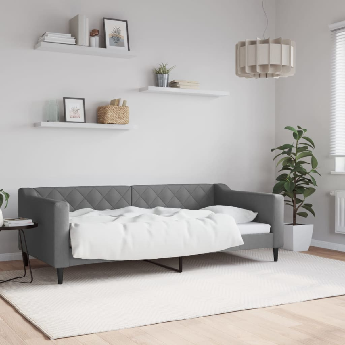 This 2-in-1 day bed, serving as both a sofa and bed, makes a practical and eye-catching addition to your living room or bedroom. Versatile day bed: The sofa bed can be used as a sofa during the day, or as a bed at night to offer a quick solution to accommodate overnight guests.Comfortable experience: The daybed is made of fabric. The fabric features a simple and clean look while remaining breathable and long-lasting. In addition, the backrest and armrests of the guest bed are padded with foam to improve the seating experience.Sturdy and stable frame: The main frame of the sleeper sofa is made of metal and solid wood, making it very sturdy and durable. These plywood slats allow better air circulation to keep the mattress fresher for longer while improving the weight capacity and ensuring stability.Modern design: The couch bed has a modern design that features clean lines, a minimalistic look, as well as natural light, and will add a modern style to your interior! Good to know:A mattress is not included with this bed. We do offer a various selection of mattresses. You can check our shop for a matching mattress.