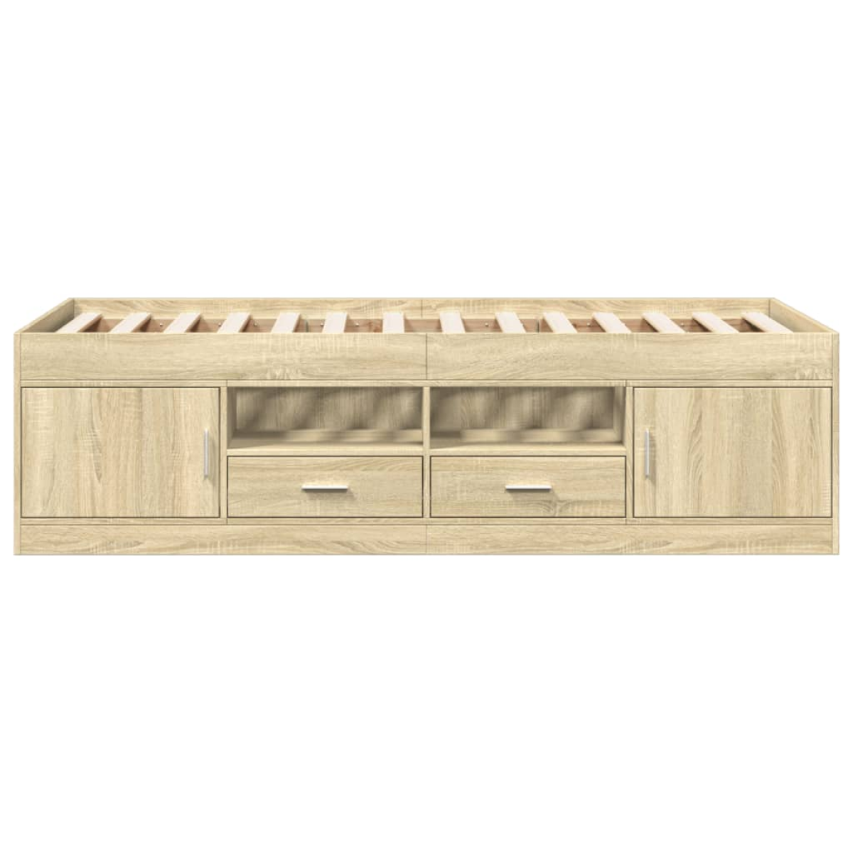 This versatile day bed can be used not only as a bed in the bedroom but also as a sofa in the living room. It will suit your different needs perfectly, providing you with plenty of space for sleeping or resting. Solid construction: This day bed sofa has a sturdy frame made of engineered wood. The engineered wood is of exceptional quality with a smooth surface and features strength, stability and resistance to moisture.Storage function: The included bed drawers provide ample storage space for storing your essentials, keeping your room clean and tidy.Sturdy slats: The plywood slats provide good weight distribution, ensuring that the mattress stays in place with every twist and turn of your body during sleep. Good to know:A mattress is not included with this bed. We do offer a various selection of mattresses. You can check our shop for a matching mattress.