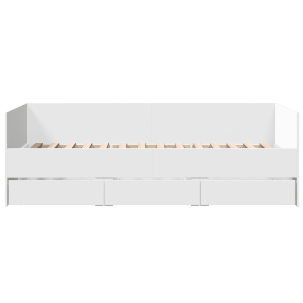 This 2-in-1 daybed with drawers, serving as both a sofa and bed, makes a practical and eye-catching addition to your living room or bedroom. Versatile daybed: The sofa bed functions as a sofa during the day and easily converts into a double bed at night by pulling out the trundle, providing a convenient solution for hosting guests and maximising space. Ample storage space: This guest bed has 3 drawers with wheels that provide ample space for storing your clothes, socks, toys, cushions, etc.Solid construction: This day bed sofa has a sturdy frame made of engineered wood. The engineered wood is of exceptional quality with a smooth surface and features strength, stability and resistance to moisture. Good to know:The delivery includes a daybed frame only. The mattress is not included. You can check our shop for the matching mattresses.