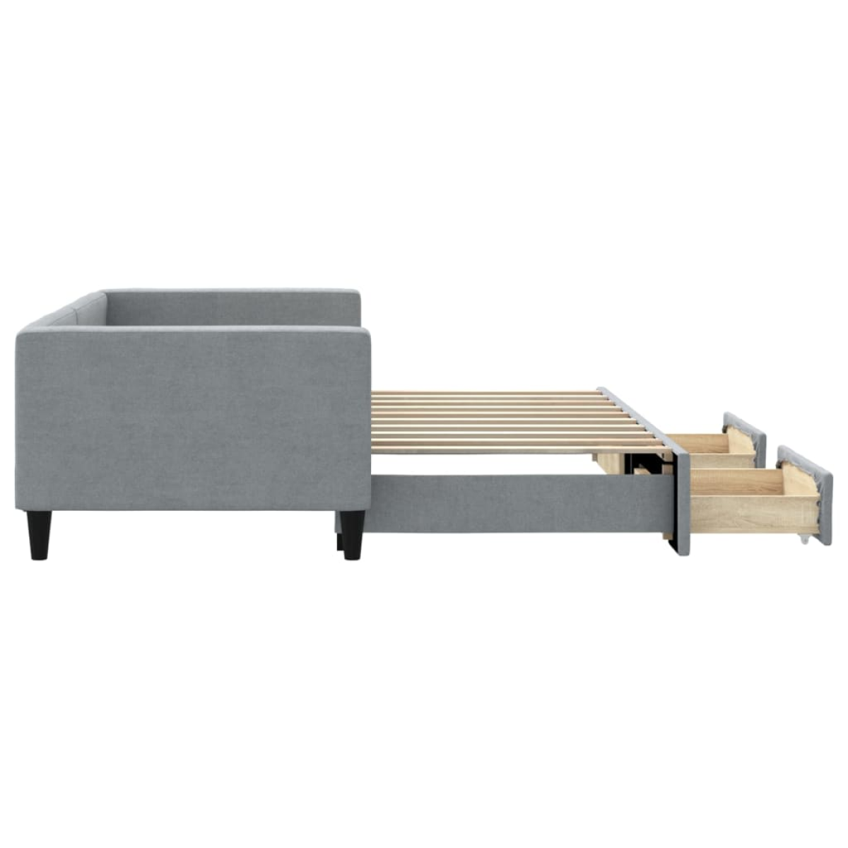 This 2-in-1 daybed with trundle, serving as both a sofa and bed, makes a practical and eye-catching addition to your living room or bedroom. Versatile daybed: The sofa bed functions as a sofa during the day and easily converts into a double bed at night by pulling out the trundle, providing a convenient solution for hosting guests and maximising space.Ample storage space: This guest bed has two drawers with wheels that provide ample space for storing your clothes, socks, toys, cushions, etc.Durable fabric and solid construction: This day bed sofa has a sturdy frame made of wood and metal and is upholstered in durable and comfortable fabric.Modern design: The couch bed has a modern design that features clean lines, a minimalistic look, as well as natural light, and will add a modern style to your interior! Good to know:Mattresses are not included with this bed. We do offer a various selection of mattresses. You can check our shop for matching mattresses.