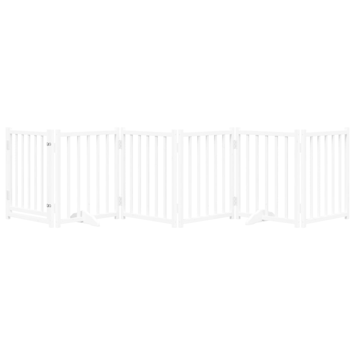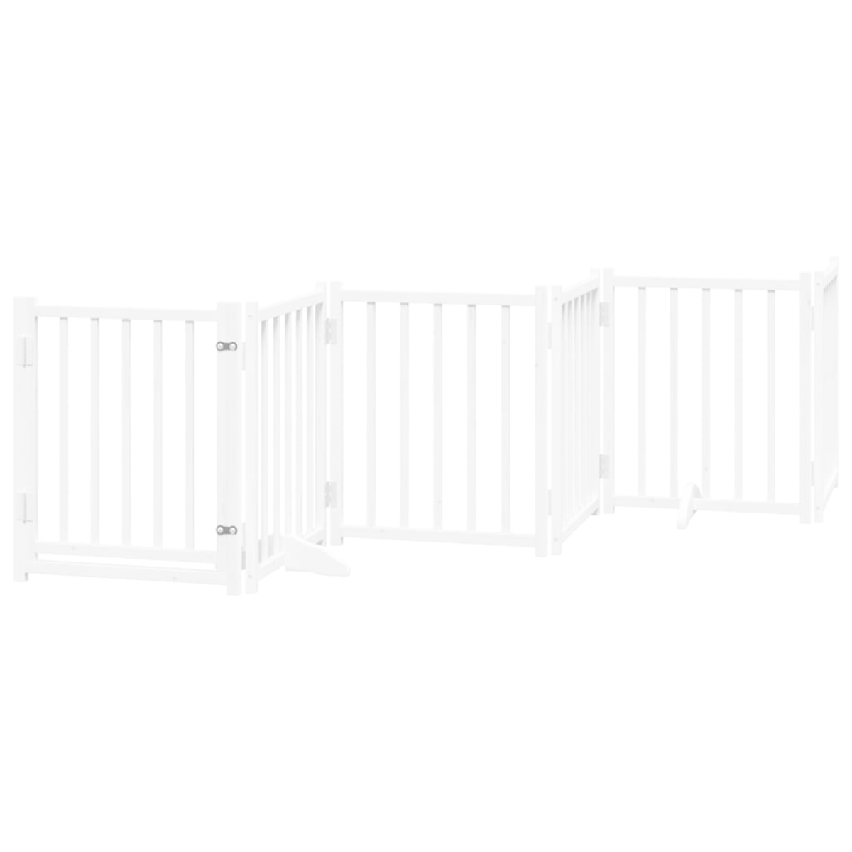 The dog gate puts your pet in a fixed activity area, which can keep your pet safe and prevent you from being disturbed.Durable material: The dog gate is made of solid fir wood with water-base paint, making it durable, long-lasting, and easy to clean.Easy to use: The dog gate does not require installation or drilling that doesn't damage your home. This dog gate can be totally foldable when without feet, making it easy to carry and store in the closet or somewhere else.Practical design: The dog gate features two sturdy feet, providing stability and allowing for easy adjustment. Additionally, it includes a door panel and is equipped with locks, providing enhanced security and convenience for both you and your pets.Multiple applications: This dog gate can effectively prevent your pets from jumping over and getting through. Therefore, it is perfect for keeping your pets safe in the living room, kitchen, stairs, and doorway.