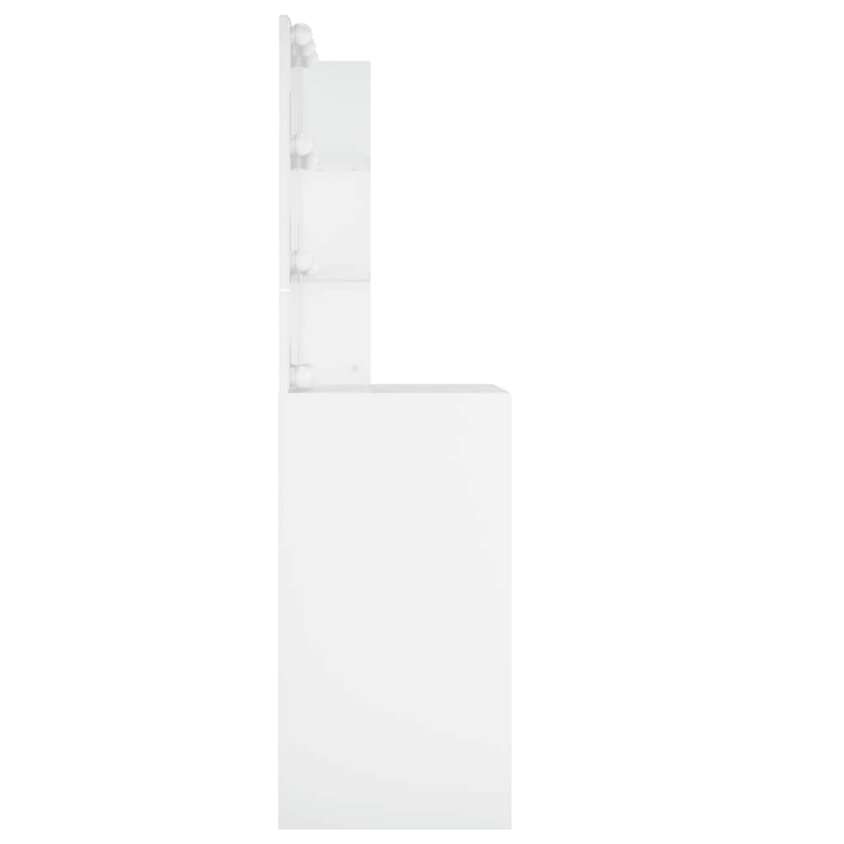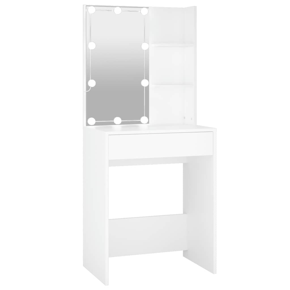 Featuring refined straight lines and an asymmetrical shape brimming with uniqueness, this dressing table is sure to turn heads! Durable material: The engineered wood is of exceptional quality with smooth surface and also features strength, stability and resistance to moisture.LED light: The cosmetic table has LED bulbs with USB, which are easy to switch modes from warm to cold white. The featured LED bulbs around mirror illuminate your beauty as well.Ample storage space: A spacious drawer and two open shelves on this makeup table give enough storage to organise your items and also make your room tidy and clean.WARNING:In order to prevent overturning, this product must be used with the wall attachment device provided. Note:Each product comes with an assembly manual in the box for easy assembly.