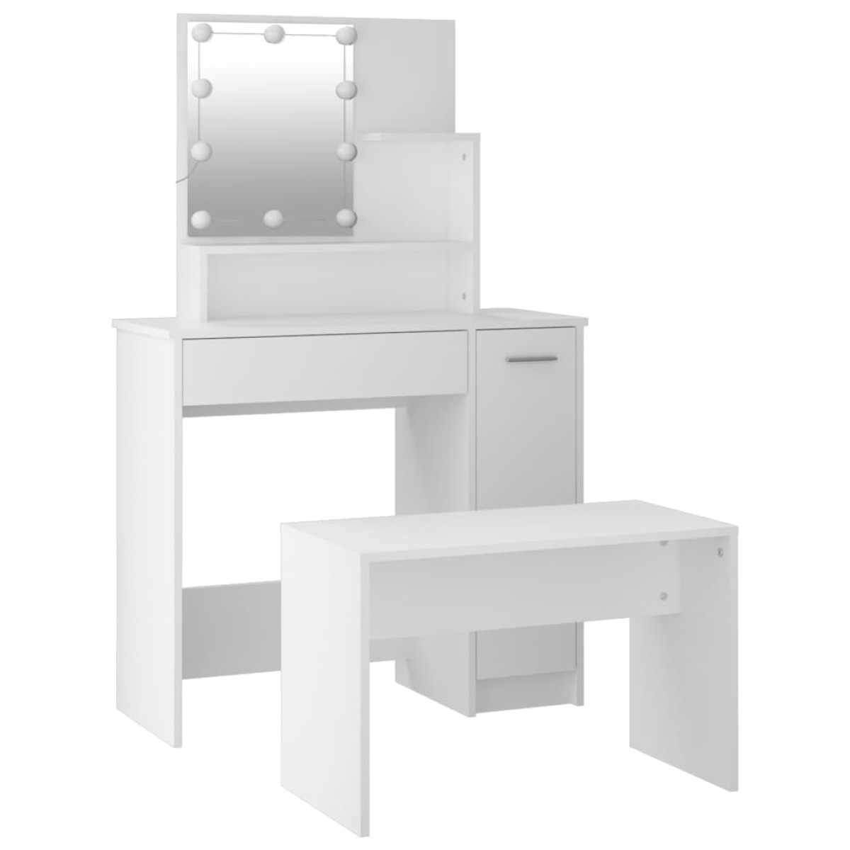 The trendy dressing table set gives your bedroom a timeless, refined look. The dressing table set with LED is a perfect addition to your bedroom decor and also keeps your cosmetics close at hand! Stable material: The engineered wood is of exceptional quality with smooth surface and also features strength, stability and resistance to moisture.Utility mirror: The dressing table with mirror is perfect for your daily beauty routine. The mirror allows you to take care of your facial skin and wear your makeup too!Ample storage space: The dressing table with stool provides ample space for easy access to your make-up, jewellery and everyday essentials.LED light: The dressing table also has LED bulbs with USB, which are easy to switch modes from warm to cold white. The featured LED bulbs around mirror illuminate your beauty as well.Wide applications: This dressing table set is suitable for various scenes, such as your bedroom, cloakroom and any other room you want to place it in. WARNING:In order to prevent overturning, this product must be used with the wall attachment device provided. Note:Each product comes with an assembly manual in the box for easy assembly.