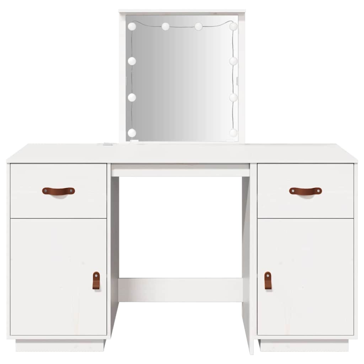 This trendy wooden dressing table set with LED is an excellent addition to your bedroom decor. It also keeps your cosmetics within reach! Solid pine wood: Solid pine wood is a beautiful natural material. Pine wood has a straight grain, and the knots give the material its signature, rustic look.Ample storage: This makeup table provides ample space and easy access to your make-up, jewellery and daily essentials.Utility mirror: The included beautiful mirror provides a clear view for makeup application and adds an elegant touch to the vanity table.LED light: The vanity desk has LED bulbs with USB, which are easy to switch modes from warm to cold white. The featured LED bulbs around the mirror illuminate your beauty as well.Practical door: Keep your essentials free from dust by hiding them behind the door of this makeup vanity desk. Warning:In order to prevent overturning, this product must be used with the wall attachment device provided. Note:Each product comes with an assembly manual in the box for easy assembly.