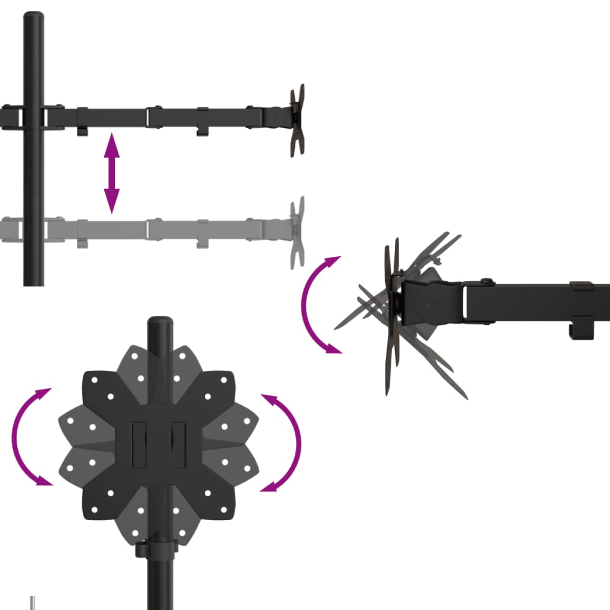 Have you ever complained about limited desktop space? Have you ever experienced neck and shoulder strain from sitting for long periods of time? Then this adjustable dual monitor stand is your best choice! Adjustable in many ways: This monitor stand can tilt up or down by 90°, swivel left or right by 90° or 120°, and rotate 360°. You can also adjust its height for the best viewing. Cable organiser: The monitor holder has a hidden clip to organise cables and a storage slot for Allen keys, helping to keep your desk neat and tidy. Easy installation: This monitor stand for desk comes complete with instructions and all the fixtures and fittings needed for easy installation. Sturdy material: Steel is an exceptionally hard and strong material. It offers sturdiness and stability. In addition, the wider freestanding base also increases the stability of this vesa monitor stand.