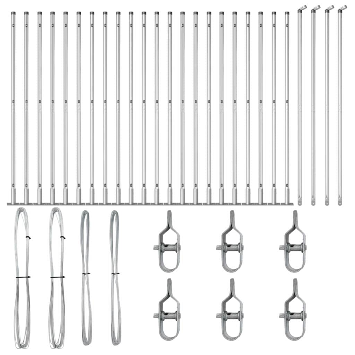 - 22 x Post, 4 x Angle post, 22 x Base plate, 22 x Plastic cap, 66 x Plastic tension wire supporter, 4 x Angle post cap, 4 x Angle post hardware, 6 x Tensioner, 2 x 25 m Binding wire, 2 x 80 m Tension wire