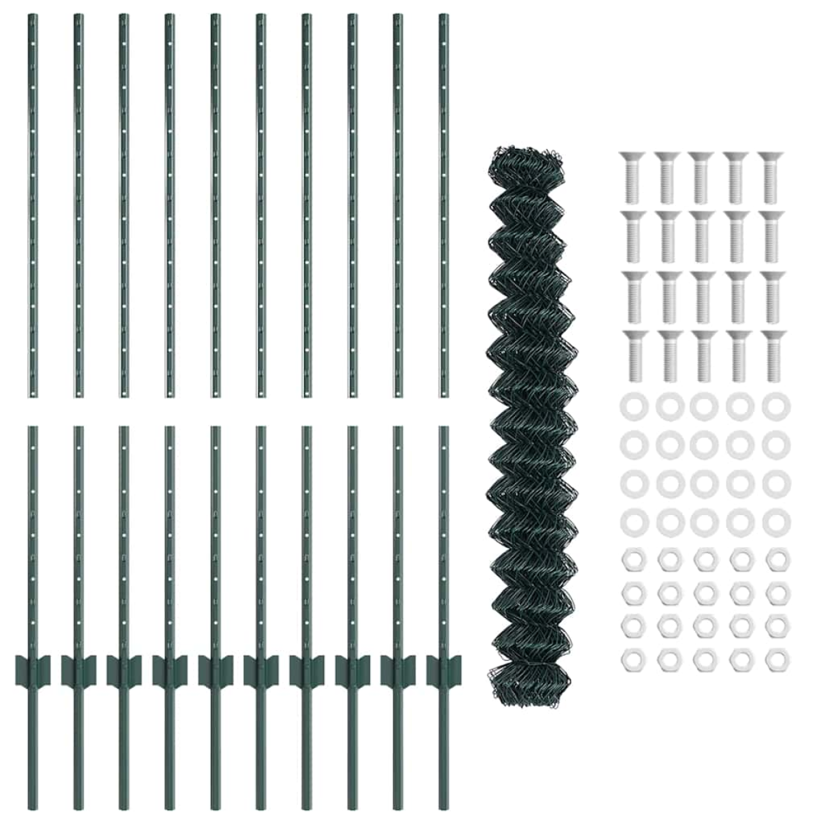 - 1 x Fence roll, 20 x Post, 1 x Set of screws and bolts