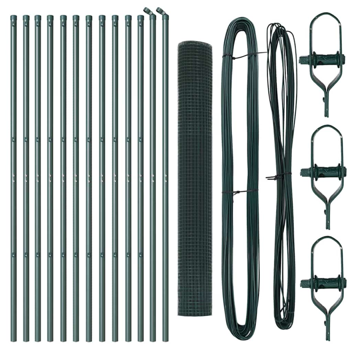 - 1 x Fence roll, 11 x Post, 2 x Angle post, 11 x Plastic cap, 33 x Plastic tension wire supporter, 2 x Angle post cap, 2 x Angle post hardware, 3 x Tensioner, 1 x 25 m Binding wire, 1 x 80 m Tension wire