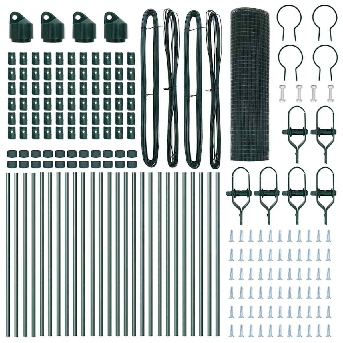- 1 x Fence roll, 22 x Post, 4 x Angle post, 22 x Plastic cap, 66 x Plastic tension wire supporter, 4 x Angle post cap, 4 x Angle post hardware, 6 x Tensioner, 2 x 25 m Binding wire, 2 x 80 m Tension wire