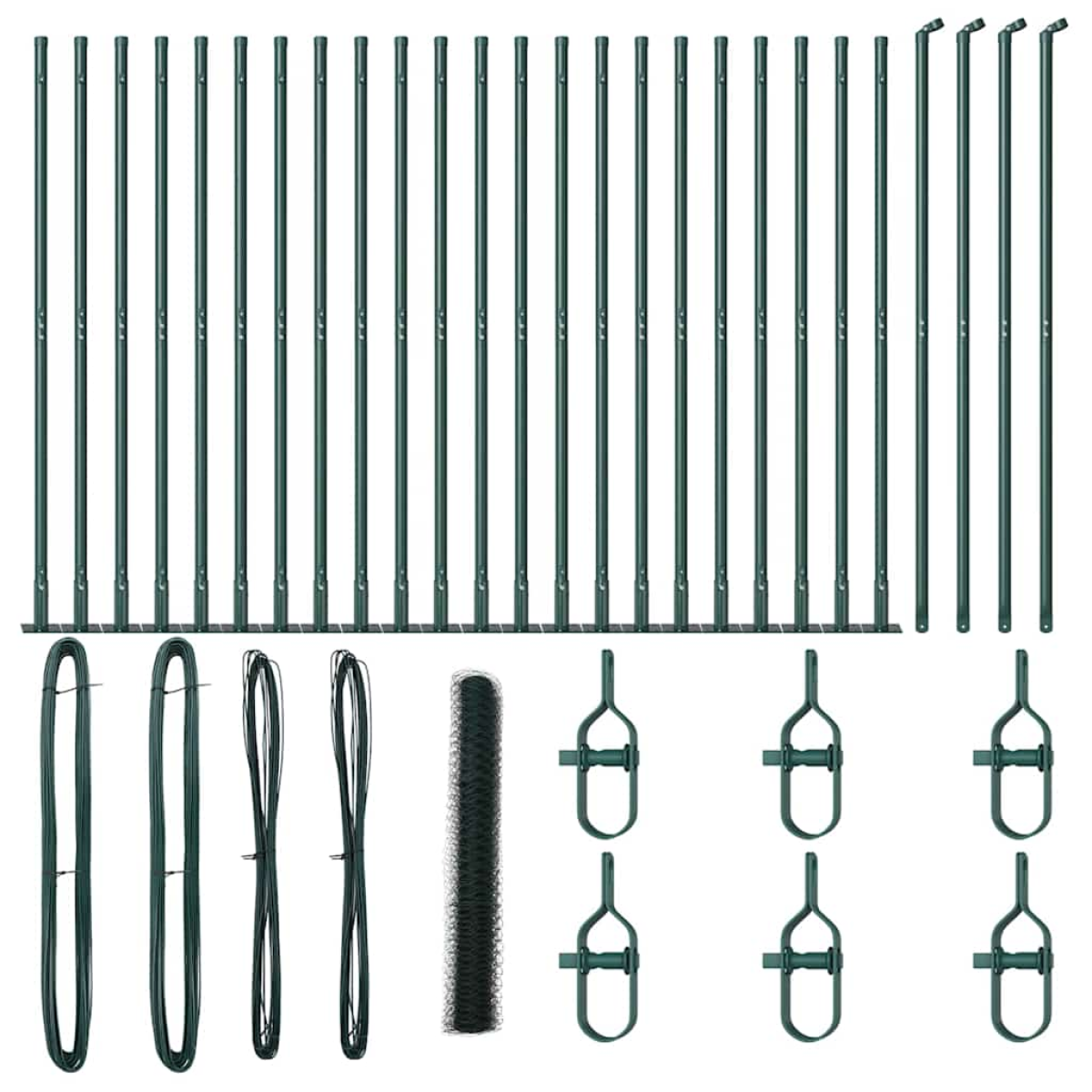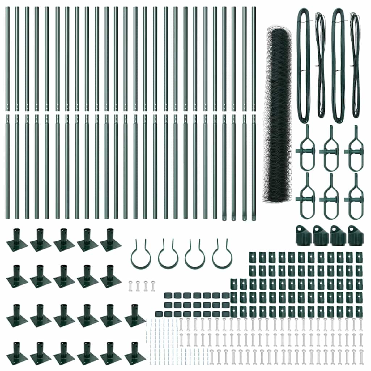 • 1 x Fence roll, 11 x Post, 2 x Angle post, 11 x Base plate, 11 x Plastic cap, 33 x Plastic tension wire supporter, 2 x Angle post cap, 2 x Angle post hardware, 3 x Tensioner, 1 x 25 m Binding wire, 1 x 80 m Tension wire