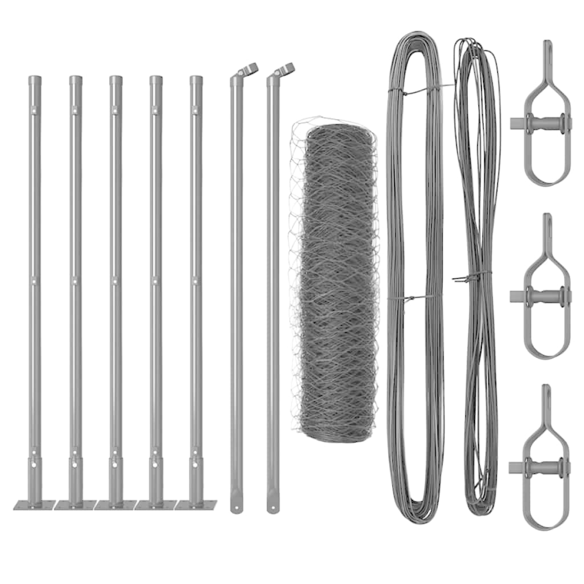 - 1 x Fence roll, 20 x Post, 8 x Angle post, 20 x Base plate, 20 x Plastic cap, 60 x Plastic tension wire supporter, 8 x Angle post cap, 8 x Angle post hardware, 12 x Tensioner, 4 x 25 m Binding wire, 4 x 33 m Tension wire